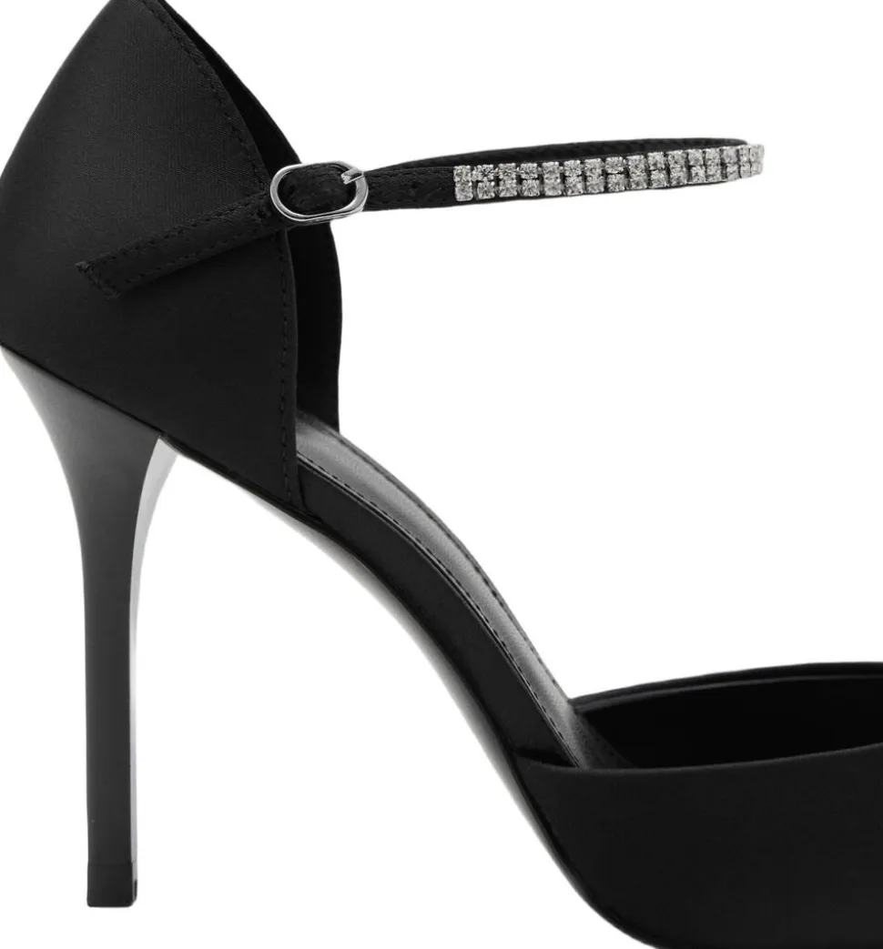 Spids rhinstensdetalje, stilethæle, spændelukning ved anklen. 8,5 cm hæl