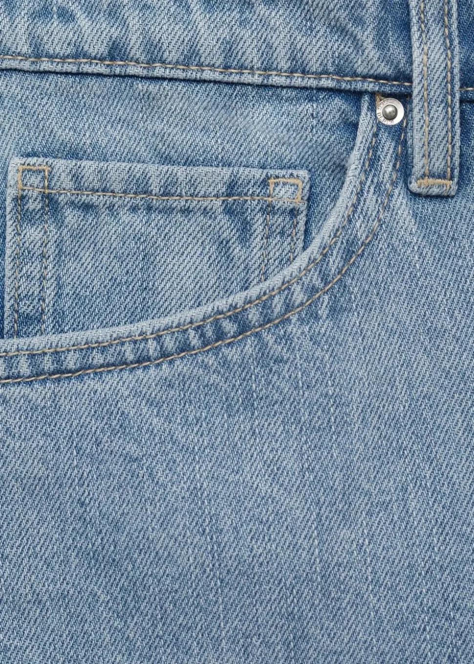 Bomuldsstof i denimstil, kort Design, lige Design, høj talje, bæltestropper, fem lommer, lynlås foran og knaplukning.