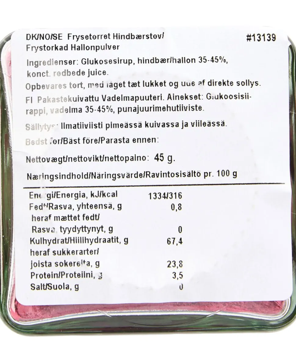 Hindbærstøv indgår i en lille perlerække af intense bærpulvere, frysetørrede bær og økologiske, spanske pistacier, der giver fantastisk smag og farve til dine desserter. Frysetørret hindbær/hallonpulver. Ingredienser: Glukosesirup, hindbær/hallon 35-45%. Næringsindhold pr. 100 g. Energi 1334/316 kJ/kcal. Fedt 0,8 g, heraf mættet fedt 0 g, Kulhydrat 67,4 g, heraf sukkerarter 23,8 g, Protein 3,5 g, Salt 0 g. Opbevares: ude af direkte sollys, tørt og lufttæt.