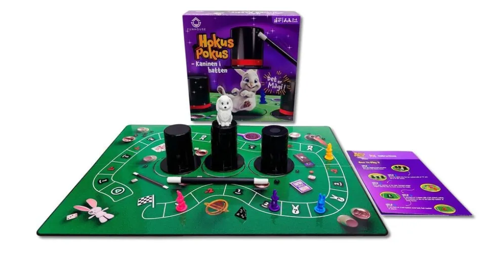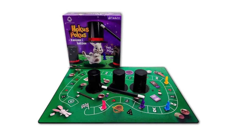Hokus Pokus – Kaninen i hatten Tag med på en magisk rejse rundt om tryllebordet i dette spændende børnespil Spillet er en herlig blanding af observation, spænding, hukommelse og trylleri der garantere hygge og sjov for hele familien Slå med terningen og ryk fremad på spillepladen Nogle felter giver dig mulighed for at gætte, hvor kaninen gemmer sig, mens andre blander hattene rundt Kan du h uske hvilken hat der gemmer på den magiske kanin, så sving med tryllestaven og tryl den frem! Gætter du rigtigt kan du hoppe 3 felter frem – gætter du forkert m å du 3 felter tilbage Spilletid ca 30 minutter For 2-4 spillere Fra 4 år Hokus Pokus – Er du klar til at trylle kaninen ud af hatten og nå først frem til målstregen?