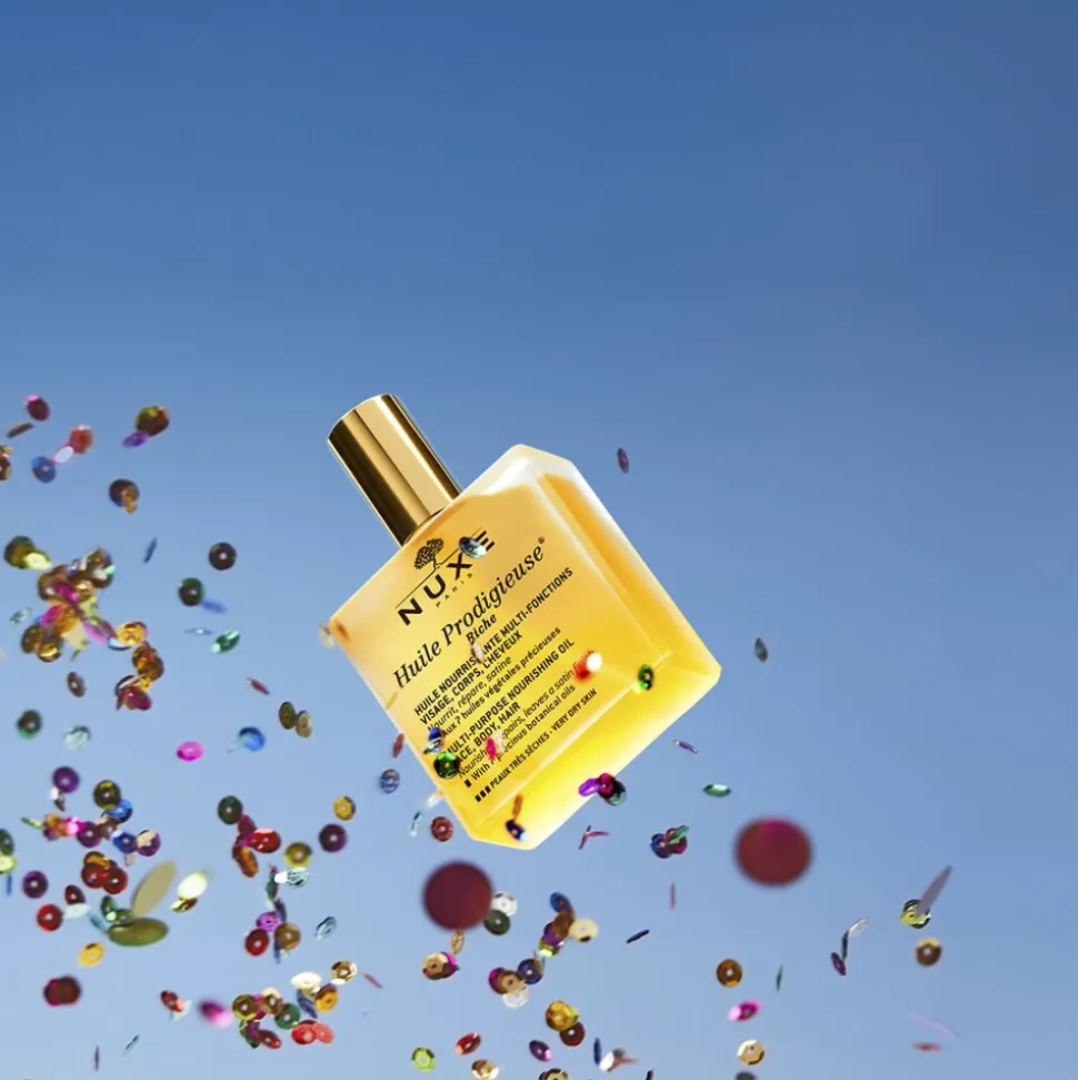Huile Prodigieuse Riche er en multifunktionel olie til ansigt, krop & hår, som nærer, reparerer og blødgør. Nuxe ikoniske Huile Prodigieuse – her i en ekstra rig og nærende udgave til den meget tørre hud.