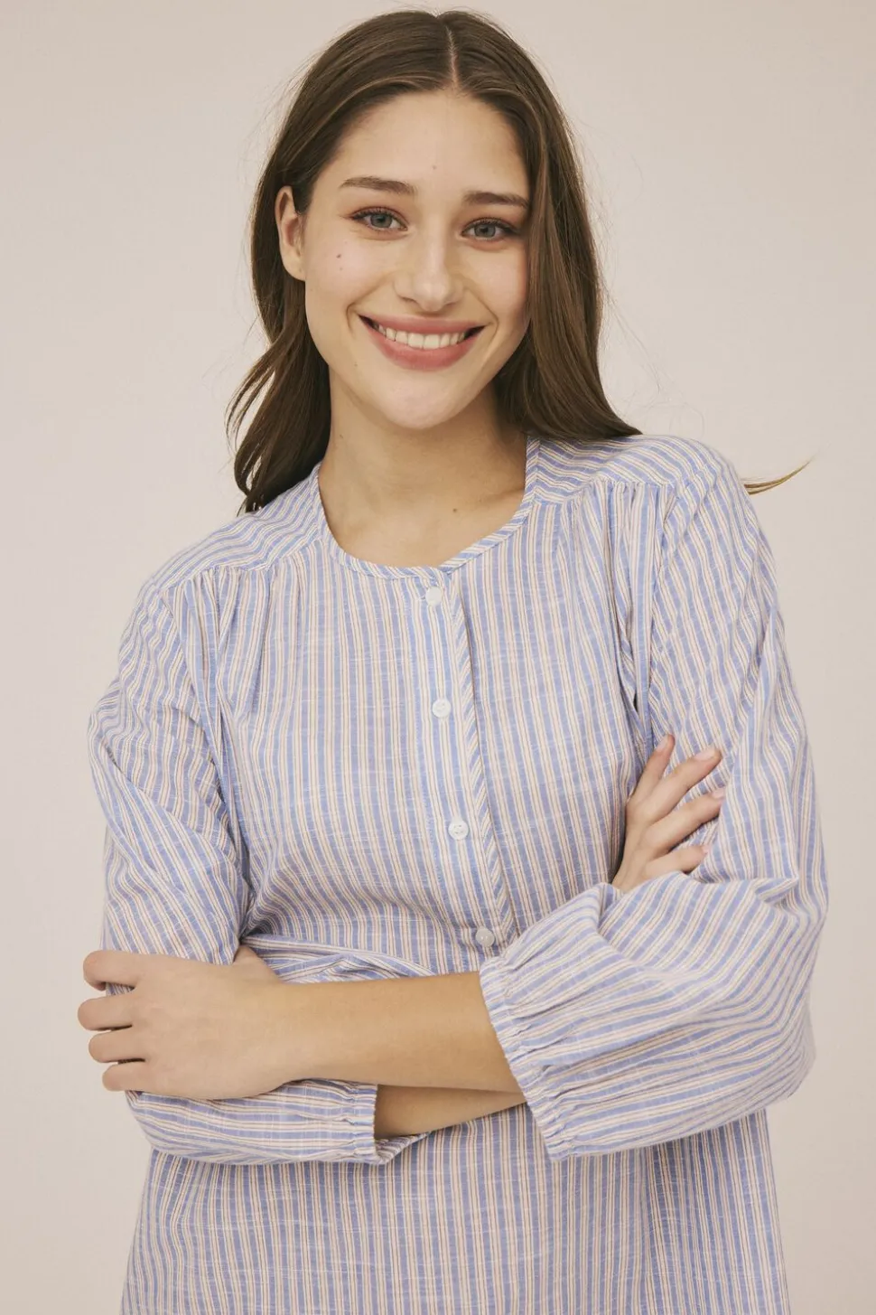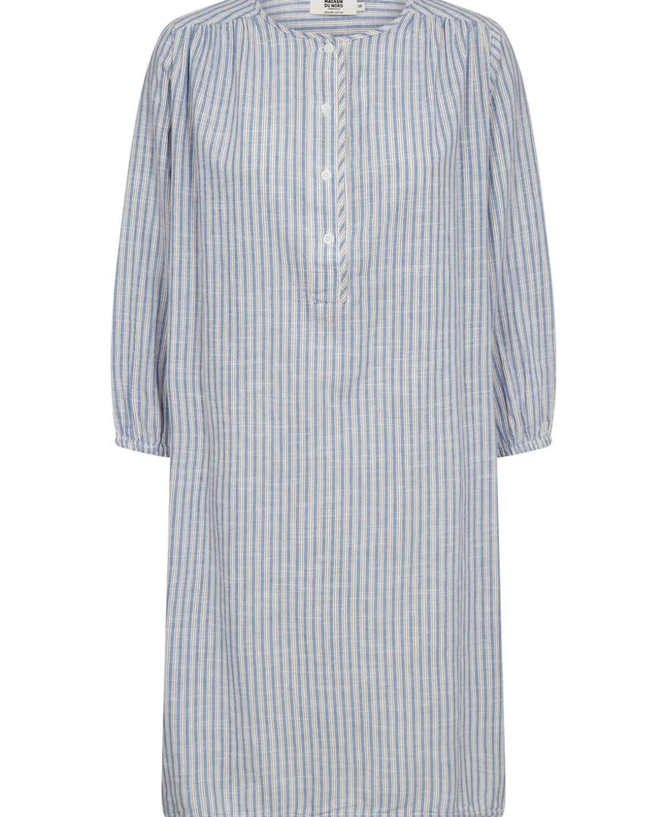 Tunika fra Magasin du Nord Collection i den blødeste kvalitet af 100% økologisk bomuld med GOTS-certificering. Kjolen har det fineste, stribede mønster, trekvartlange ballonærmer, knaplukning på brystet samt en løs pasform. En skøn tunika i den lækreste kvalitet.