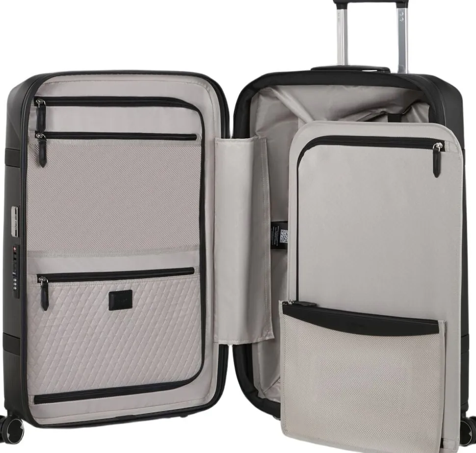 Elegant kuffert med PU detaljer, mulighed for udvidelse, polycarbonat, 4 hjul, TSA lås , indvendig stofforring lavet af genbrugte plastflasker, mulighed for personalisering med de medfølgende stickers, dobbelt trollystativ, navneskilt, vægt 3,8 kg,rumindhold 79/86 l, 5 års garanti,69x45x28/31 cm.