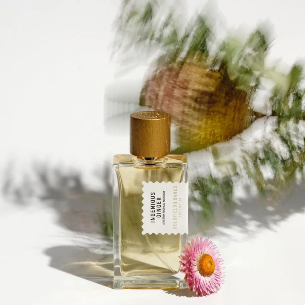 Ingenious Ginger er en olfaktorisk forestilling om den uparfumerede ingefærliljeblomst og er en abstrakt citrus-, blomster- og amberagtig parfume, der udtrykker Goldfield & Banks grundlæggers mest elskede tropiske blomst, som vokser i overflod ved hans feriehus i de fugtige troper. Denne opløftende parfume åbner med en eksplosion af bergamotte, som forstærkes af den sprudlende duft af ingefær, den funklende mandarin og den strålende og solrige aura af magnolia.