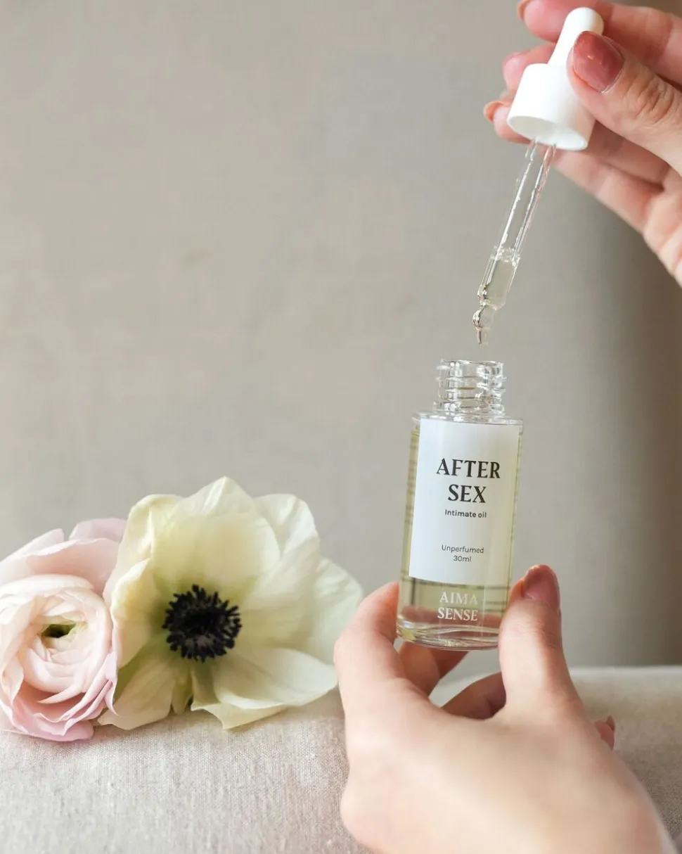 Aima Sense After Sex intimplejeolie er fremstillet i Sverige med naturlige ingredienser, der blødgør, beroliger og plejer den sarte hud. Olien behøver ikke skylles af og kan selvfølgelig bruges på hele kroppen egner sig både til dig og din eventuelle partner.