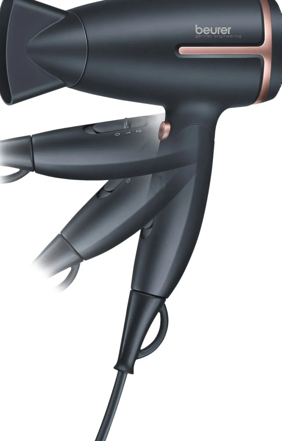 Den ioniske rejsehårtørrer med voltskifte kan du tage med dig overalt og bruge i hele verden.