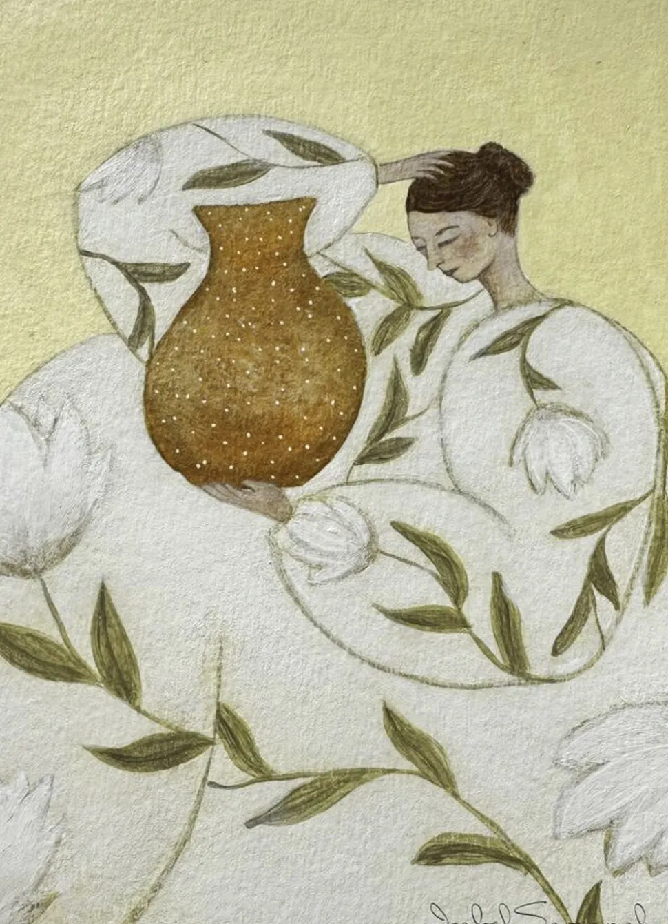 En elegant plakat med et poetisk motiv af en kvinde, der kærligt omfavner en vase. Designet i blide nuancer af beige, hvid og gyldenbrun, hvor naturens elementer skaber en rolig og æstetisk atmosfære. Perfekt til stuen, soveværelset eller som gave til kunstelskere. En tidløs og stilfuld tilføjelse til den moderne boligindretning.