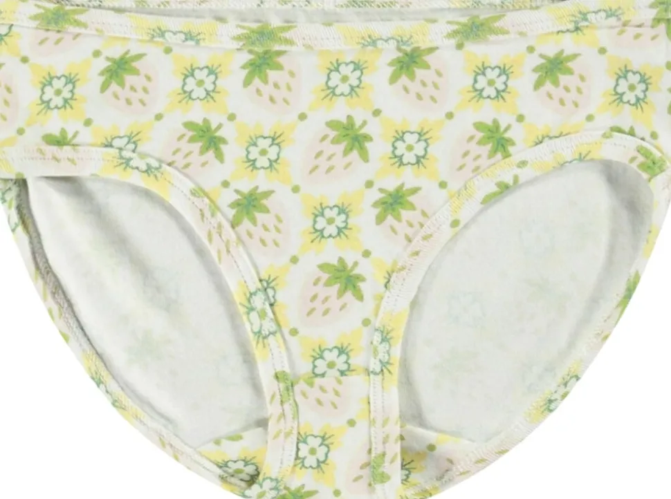Undertøjssæt i råhvid og blød, økologisk bomuld med et fint allover print af lyserøde jordbær og blomster. Sættet inkluderer en undertrøje med tynde stropper og tilhørende underbukser med en bred elastikkant for optimal komfort.