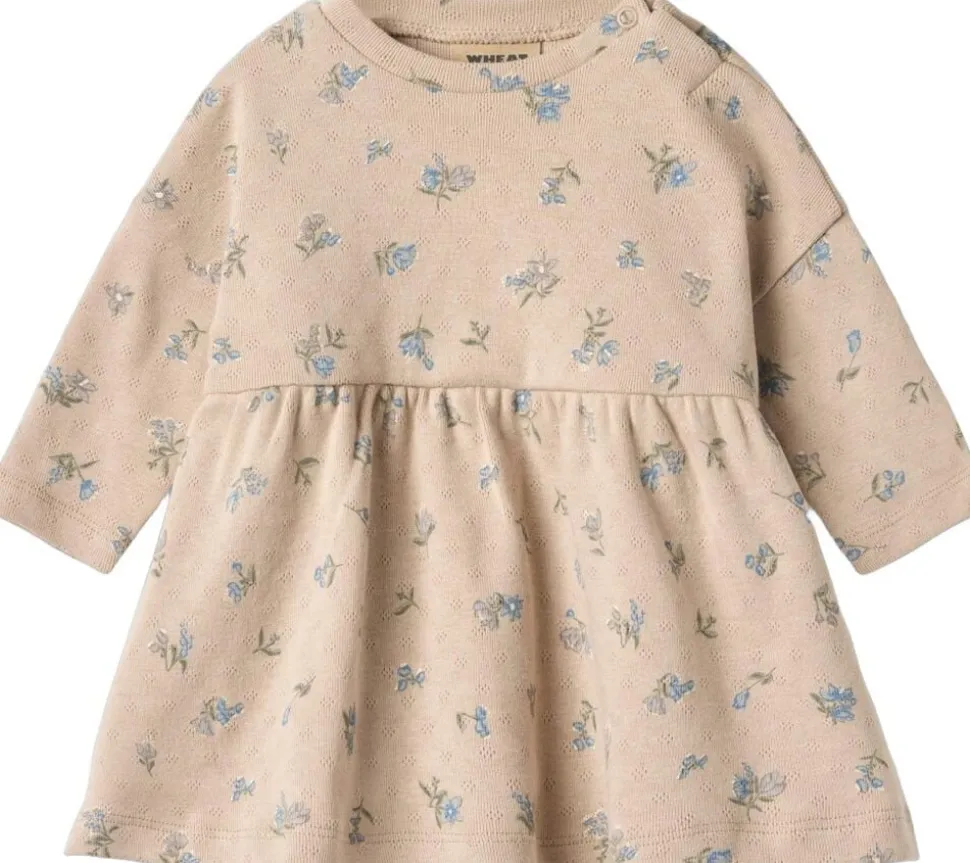 Langærmet jerseykjole i blødt økologisk bomuld til din baby. – Løstsiddende – Længde: Over knæene – Lav skuldersøm – Skæring i taljen med samlinger nedenfor – Trykknapper på venstre skulder – Wheat signaturprint Wheat’s kjole har en løstsiddende pasform, hvilket gør den nem og behagelig for dit barn at have på. Kjolen har en flatterende skæring med læg og fylde, hvilket giver kjolen god volumen i skørtet. Kjolen er perfekt til efteråret og vintermånederne og kan let styles med en body og leggings under. Tilføj en cardigan på de kølige dage for at fuldende looket. — – Standard 100 fra OEKO-TEX® – 100% Økologisk bomuld