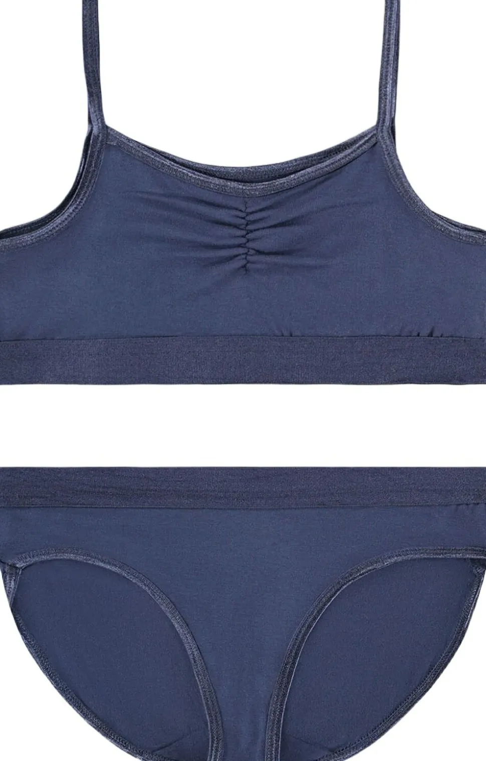 Lyseblåt undertøj i blød og strækbar viskose. Toppen har smalle, elastiske stropper og en rynket søm foran, som giver et elegant snit. Både top og underdel er udstyret med en bred elastikkant, der sikrer en god pasform og høj komfort.