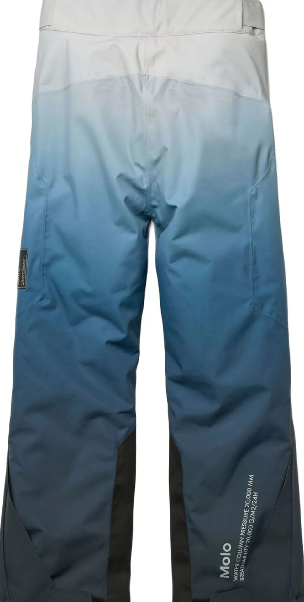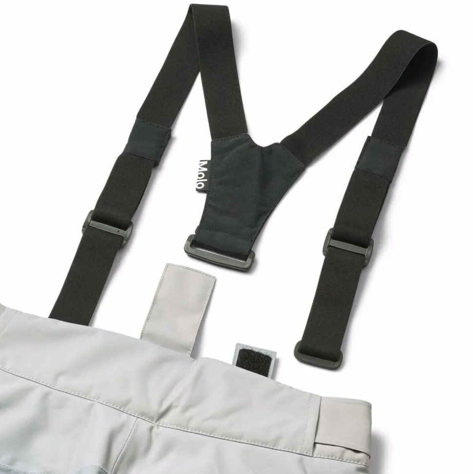 Disse blå overtræksbukser fra Molo er lavet i genanvendt polyester. Bukserne har trykknap- og lynlåslukning, udvendige, justerbare velcro-stropper, bælte stropper til Molos seler (ekstra tilbehør), justerbar benåbning med snefang og ekstra forstærkning mellem benene. Der er vandtætte lommer, refleks bagpå, fleece foret udsatte steder og vatteret med 3M Thinsulate.