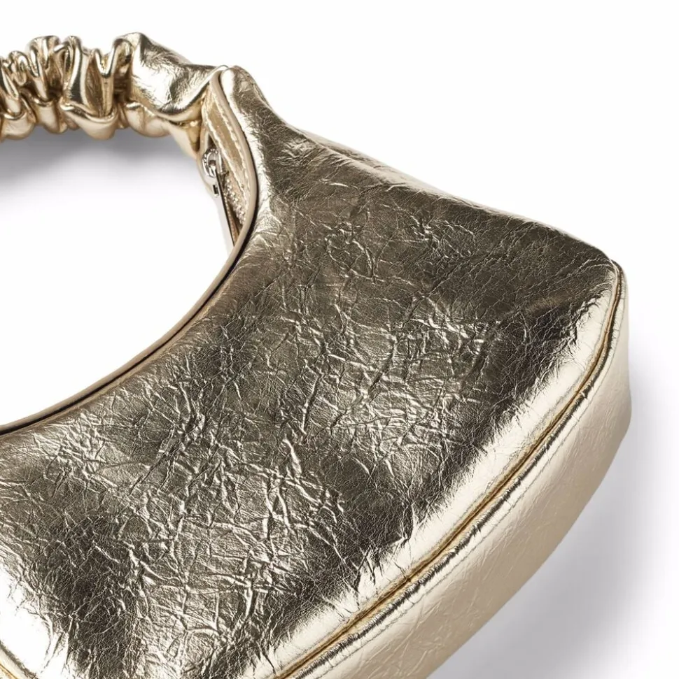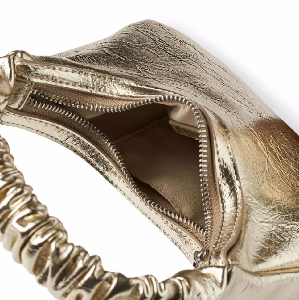 Guldfarvet håndtaske fra Molo med lynlåslukning. Tasken måler 25 cm i bredden og 13,5 cm i højden.
