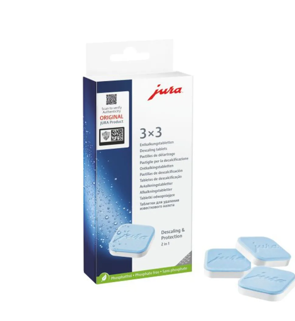 Pakke med tabletter til 3 afkalkninger. JURA afkalkningstabletter forlænger levetiden på din espressomaskine og fjerner kalk indvendigt i maskinen. Husk altid at indstille vandets hårdhed på din maskine. JURA har TÜV-certificeret deres plejeprodukter og processer, hvilket sikrer at der hverken er bakterier eller rensemidler i maskinen næste gang du skal bruge den. Anvend altid JURA plejeprodukter til at vedligeholde din JURA espressomaskine – så har du den i mange år.