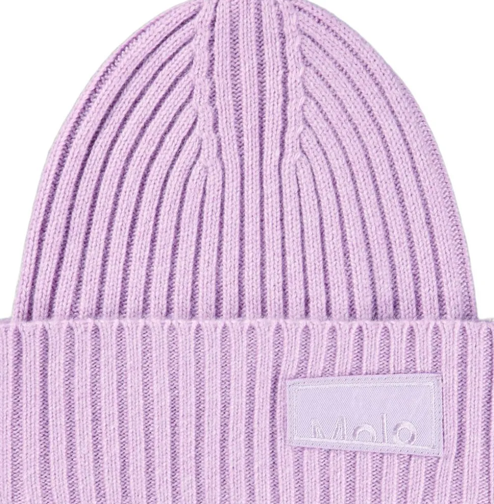 Ribstrikket hue fra Molo med ombuk og Molos logo på fronten.