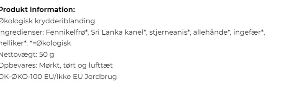 Ingredienser: Fennikelfrø, Sri Lanka kanel, stjerneanis, allehånde, ingefær, nelliker.