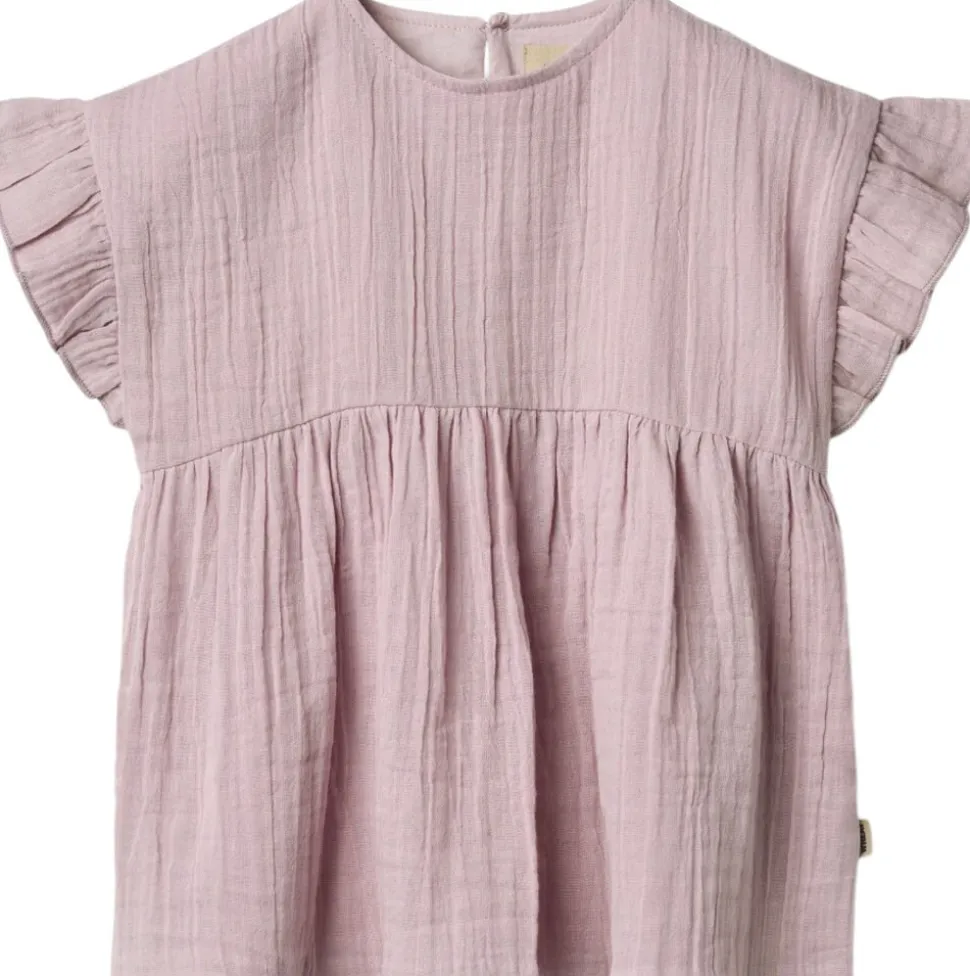 Kortærmet kjole med flæsedetaljer i økologisk bomuld til baby. – Lav skuldersøm – Flæser ved ærmegab – Skæring over taljen – Knaplukning bagpå – Længde: Over knæene – Krøllet gauze materiale Wheat’s yndige sommerkjoler har detaljer, prints- og farver, der emmer af sommer. Denne kjole har en løs pasform i skørtet, der gør det nemt for dit barn at bevæge sig rundt i den. Kjolen har et flatterende snit med bærestykke over taljen. Dette får skørtet til at synes voluminøst med læg og vidde. — – Standard 100 af OEKO-TEX® – 100% Økologisk bomuld – Produktet er GOTS-certificeret