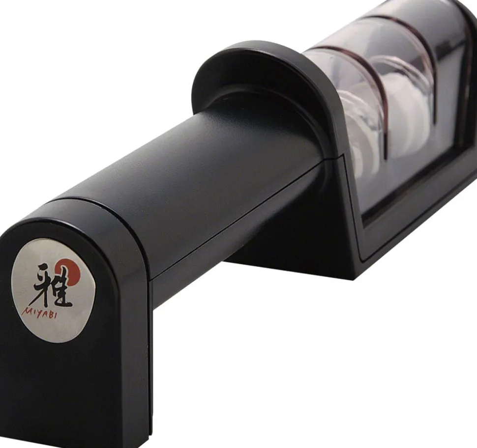 MIYABI knivskærperen er et praktisk alternativ til slibesten. Den er let at betjene, da slibevinklen er forudindstillet. Ideel til både højre- og venstrehåndede brugere. Perfekt til alle MIYABI knive og andre knive af høj kvalitet, med undtagelse af knive med bølgeskær.
