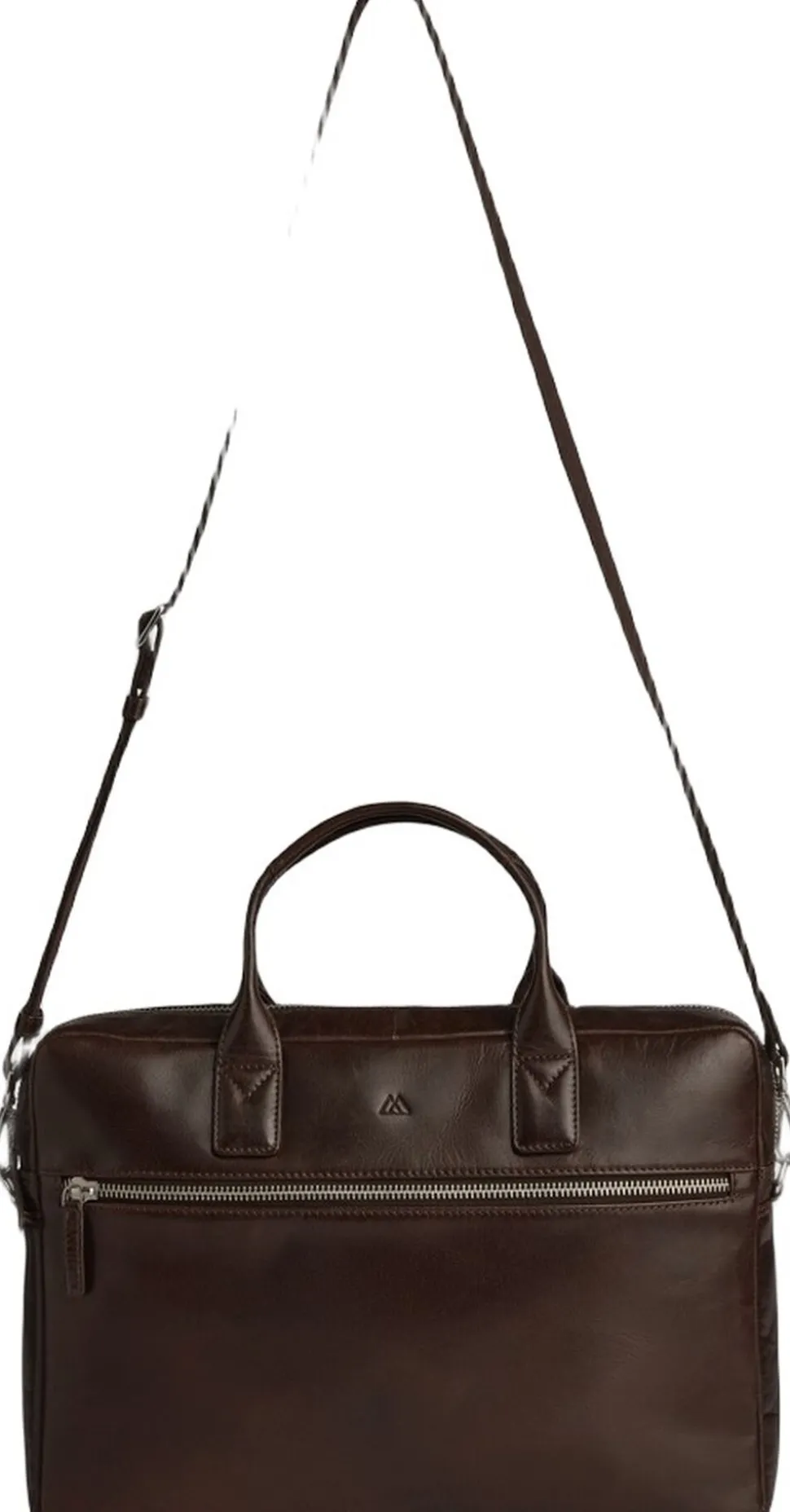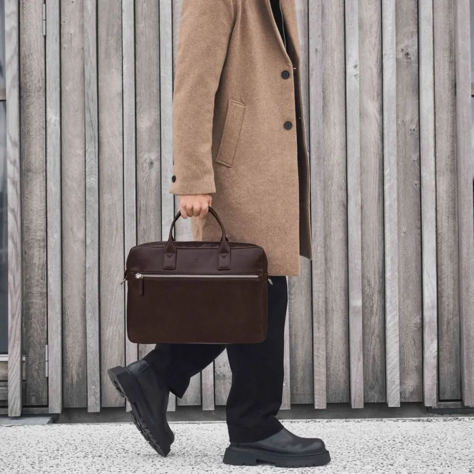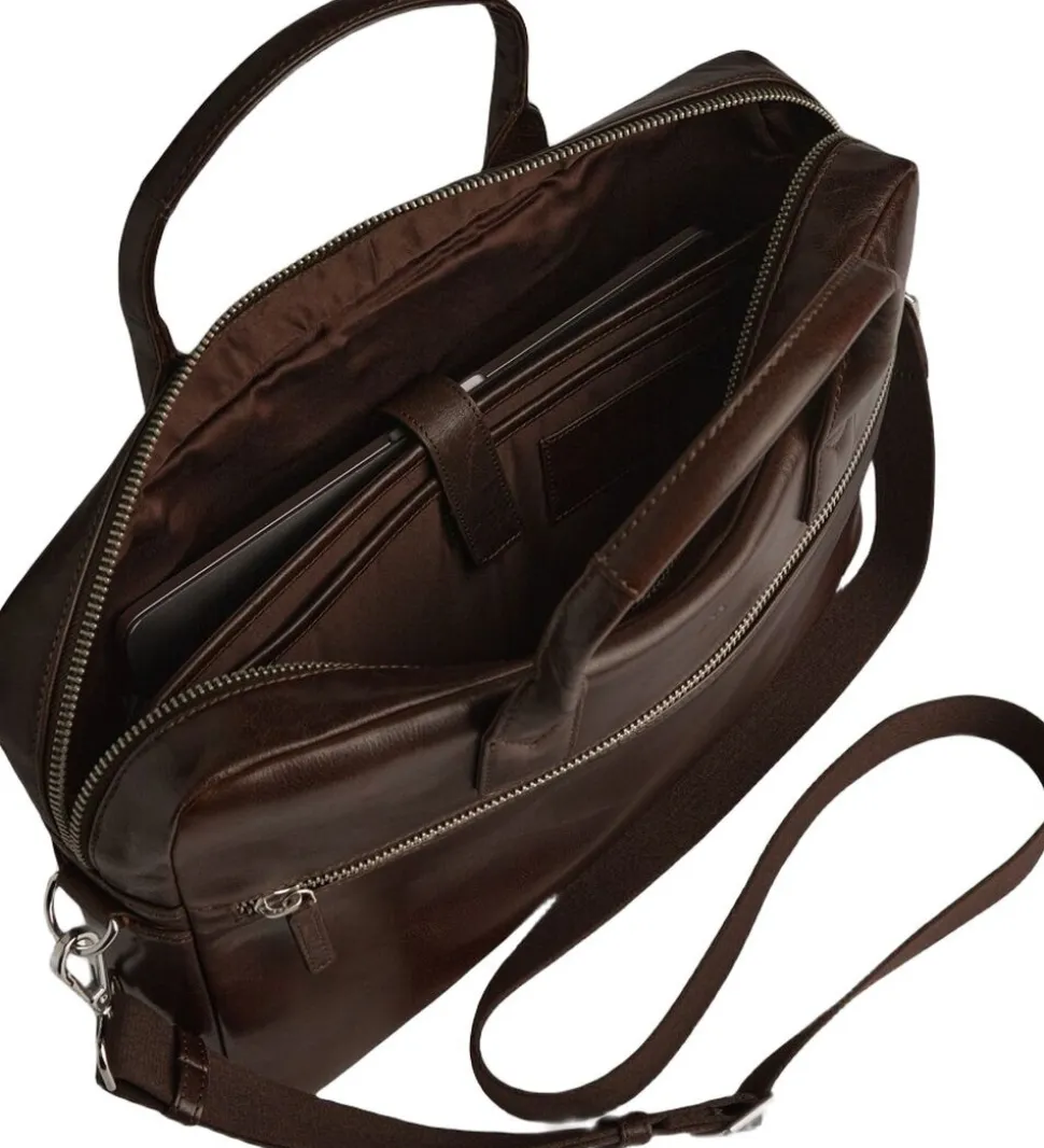 Knox Laptop Bag fra Markberg Man er en elegant og tidløs computertaske i 100% Buffalo leather. Designet kombinerer funktionalitet og eksklusivt håndværk ideel til både kontoret og rejser. Kvaliteten er LWG-certificeret og er en del af vores Zero Waste, hvor intet skind går til spilde i produktionen. Læderets struktur og nuance kan variere naturligt og giver et unikt udtryk. På fronten har tasken en god stor lynlåslomme, med plads til mindre ejendele. Taskens har ét stor hoved rum. Her er der plads til diverse dokumenter og andre ting, du har med på farten. I den ene side er der en åben lomme, samt 2 rum til kuglepinde, samt en lynlåslomme. Ved den anden side der et polstret rum, der er tiltænkt til din 14 eller 15′ computer. Lommen åbnes med et læder og velcro stykke, som holder ekstra godt på din computer. Under den er der plads til dokumenter eller en IPad. Hoved rummet lukkes med lynlås. Bagpå tasken er der en lynlåslomme, med en luggage strap der kan tages frem. Perfekt til at have på din kuffert, når du er på farten og ude og rejse. Tasken har to gode bærehanke, samt en aftagelig og justerbar skulderrem, så den kan bruges på flere måder. Taskens hardware er i metal, som er belagt og så er det nikkelfri. Taskens slidstærke for er i 100% polyester og så måler tasken 41 cm x 29 cm x 7,5 cm.