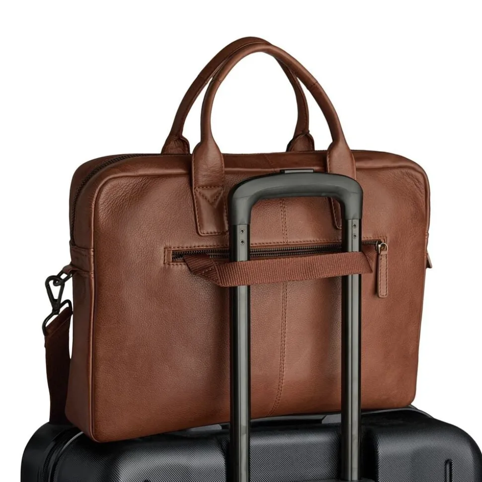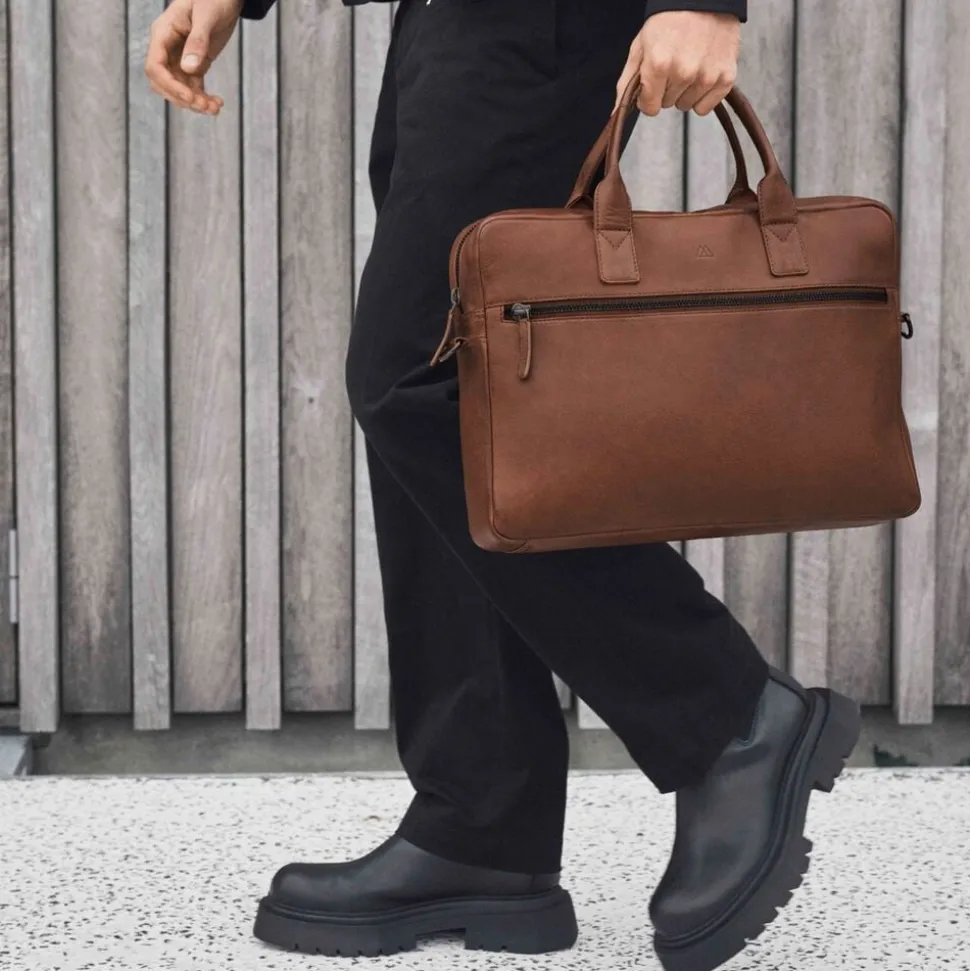 Knox Laptop Bag fra Markberg Man er en elegant og tidløs computertaske i 100% kalveskind. Designet kombinerer funktionalitet og eksklusivt håndværk ideel til både kontoret og rejser. Kvaliteten er LWG-certificeret og er en del af vores Zero Waste, hvor intet skind går til spilde i produktionen. Læderets struktur og nuance kan variere naturligt og giver et unikt udtryk. På fronten har tasken en god stor lynlåslomme, med plads til mindre ejendele. Taskens har ét stor hoved rum. Her er der plads til diverse dokumenter og andre ting, du har med på farten. I den ene side er der en åben lomme, samt 2 rum til kuglepinde, samt en lynlåslomme. Ved den anden side der et polstret rum, der er tiltænkt til din 14 eller 15′ computer. Lommen åbnes med et læder og velcro stykke, som holder ekstra godt på din computer. Under den er der plads til dokumenter eller en IPad. Hoved rummet lukkes med lynlås. Bagpå tasken er der en lynlåslomme, med en luggage strap der kan tages frem. Perfekt til at have på din kuffert, når du er på farten og ude og rejse. Tasken har to gode bærehanke, samt en aftagelig og justerbar skulderrem, så den kan bruges på flere måder. Taskens hardware er i metal, som er belagt og så er det nikkelfri. Taskens slidstærke for er i 100% polyester og så måler tasken 41 cm x 29 cm x 7,5 cm.