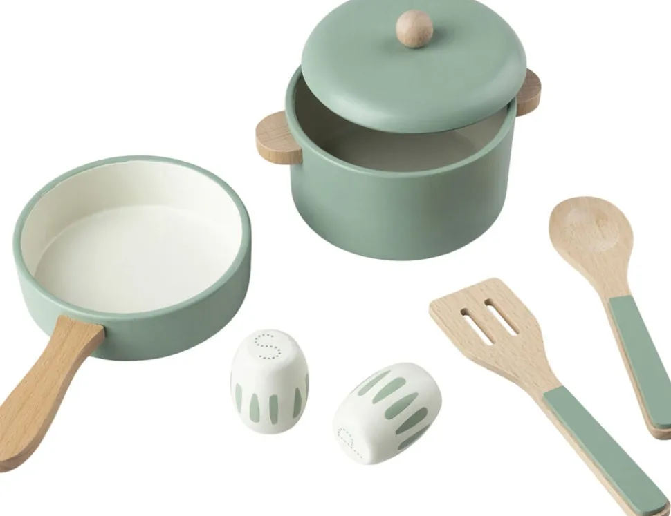 Det fine trækøkkensæt består af gryde med låg, pande, grydeske, paletkniv samt salt & pebersæt. Sættet er fremstillet af certificeret træ og en del af Sebras køkkenunivers, der også indeholder køkkenredskabssæt, spisesæt og tesæt. Alle delene passer desuden til KiDchen-legekøkkenet, der består af tre moduler.