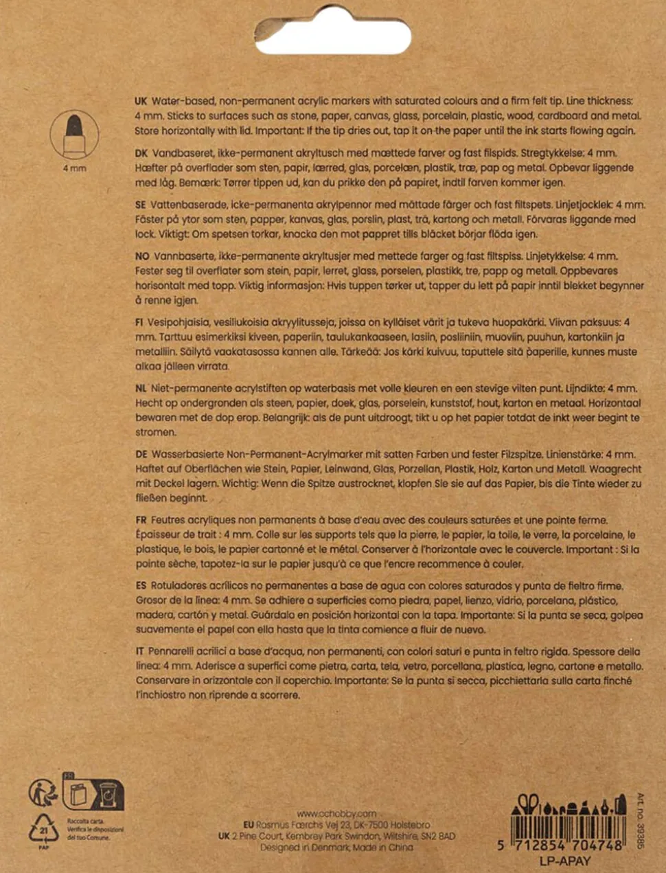 Vandbaseret, ikke-permanent akryltusch med mættede farver og fast filtspids. Du kan bruge den på sten, papir, lærred, glas, porcelæn, plastik, træ, pap og metal. Er nem at vaske af fingrene. Med vores kreative multi tusch kan du tegne på næsten alle overflader og for børn er det den perfekte tusch til kreative aktiviteter. Tuschen er nemlig ikke-permanent og er derfor nem at vaske af huden med lidt vand og sæbe. Farverne er dog rimelig vandbestandige, når de er tørre, hvilket er en kæmpe fordel, hvis I maler på sten. Desuden har tuschen en fast filtspids, som gør den nem at farvelægge med. Bemærk: Opbevar liggende med låg men hvis tippen tørrer ud, kan du prikke den på papiret, indtil farven løber ned i tippen igen.