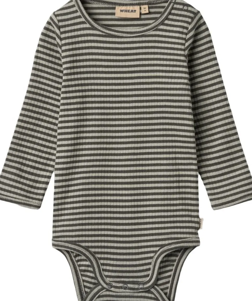 Langærmet rib body med striber i blødt økologisk bomuld til din baby. – Ribstruktur – Tæt pasform – Trykknapper på den ene skulder – Trykknapper i skridtet for bedre komfort – Stribet Wheats basis body er en sand klassiker i garderoben, når det kommer til småbørn. Denne body har trykknapper på den ene skulder samt i bunden for bedre komfort, når du skal klæde dit barn på. Brug bodyen som den inderste del i ethvert outfit, da den er blød at have tæt på huden. — – Standard 100 af OEKO-TEX® – 100% Økologisk bomuld – GOTS certificeret