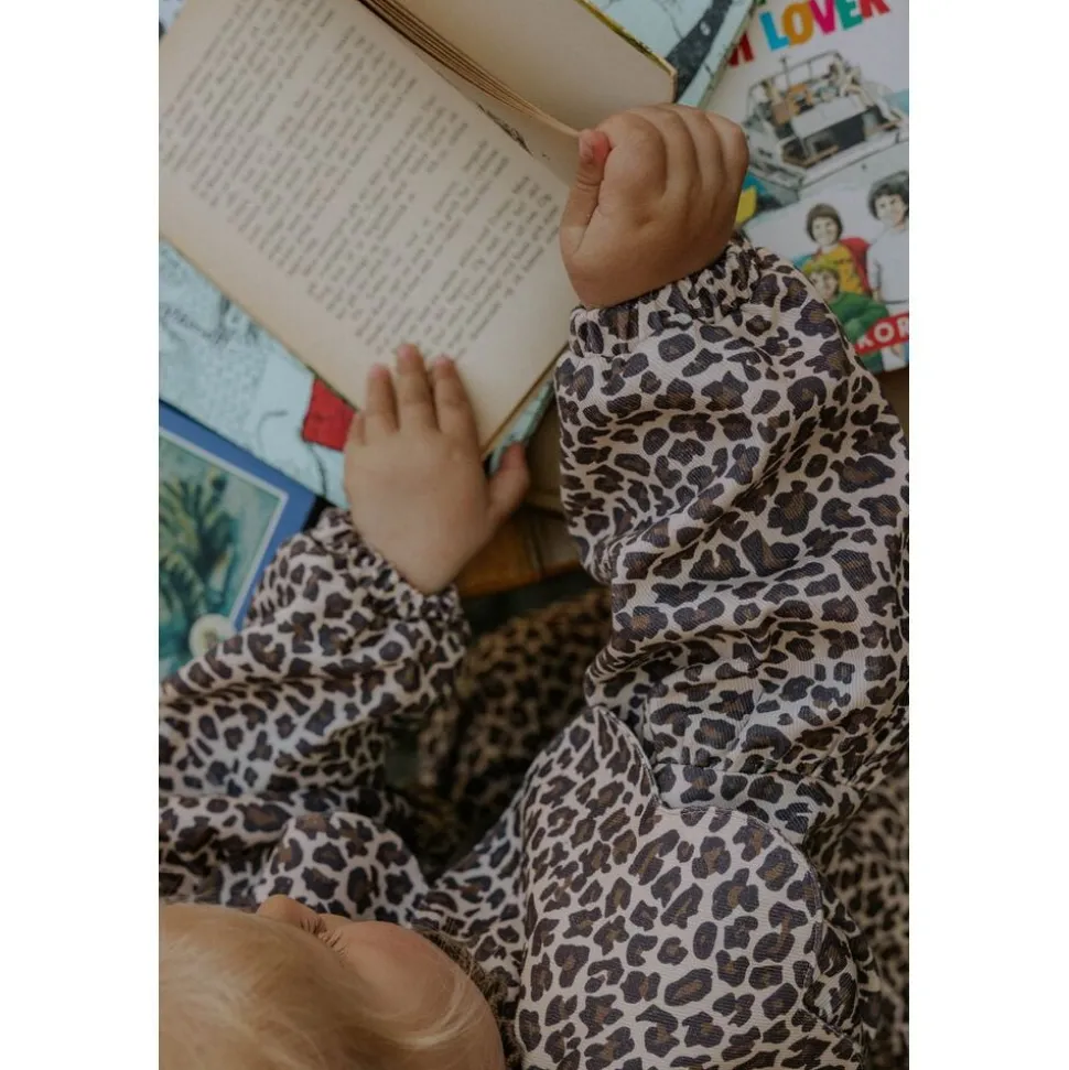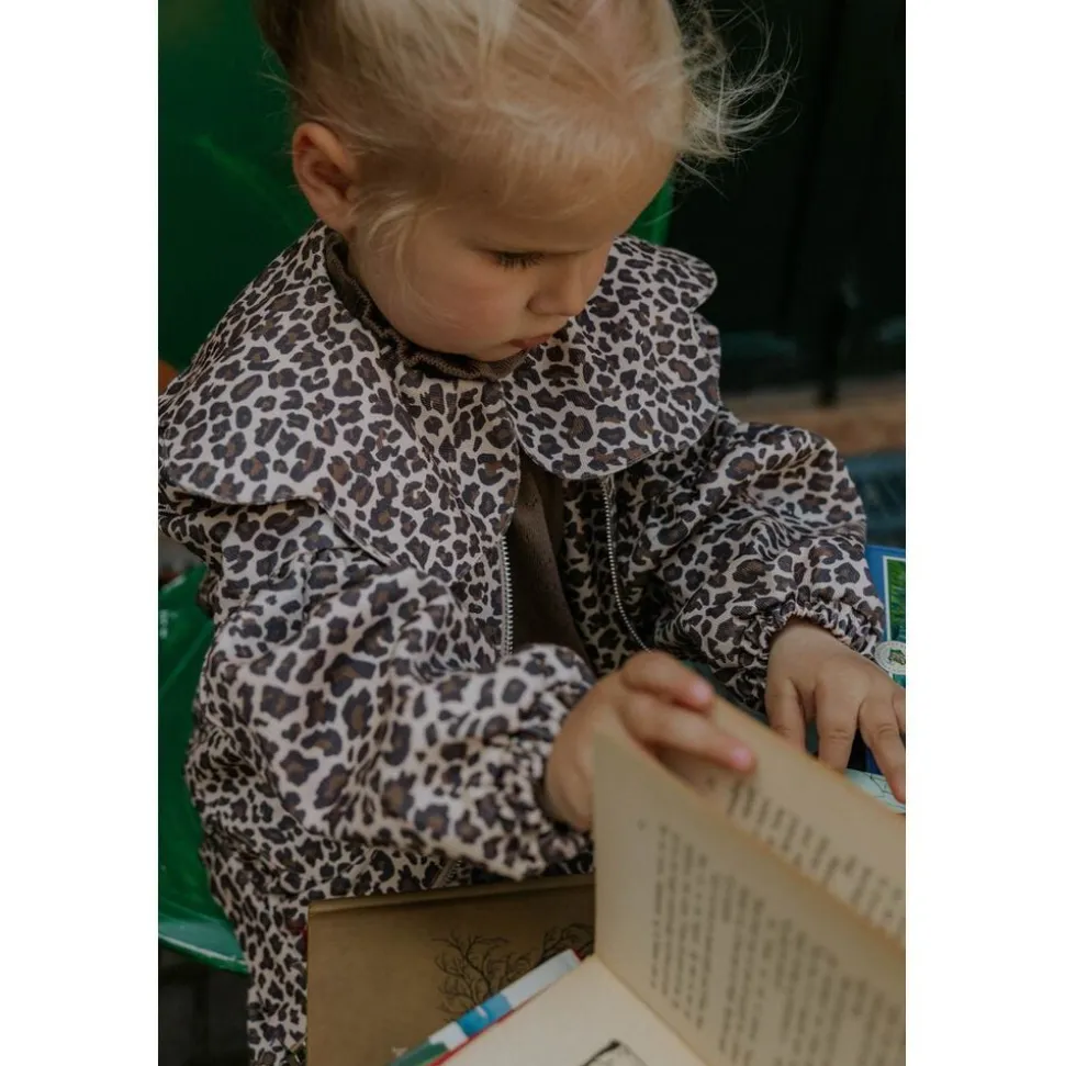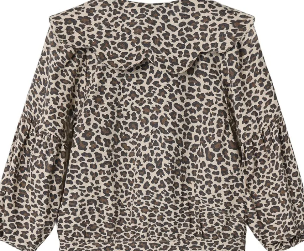 Leoprintet jakke med lange ærmer med elastik forneden så ærmet ikke falder ned over barnets hænder. Ærmerne har rynk, hvilket giver en sød detalje og volumen. Ved halsen har jakken en krave med runde buer. Jakken har lommer.