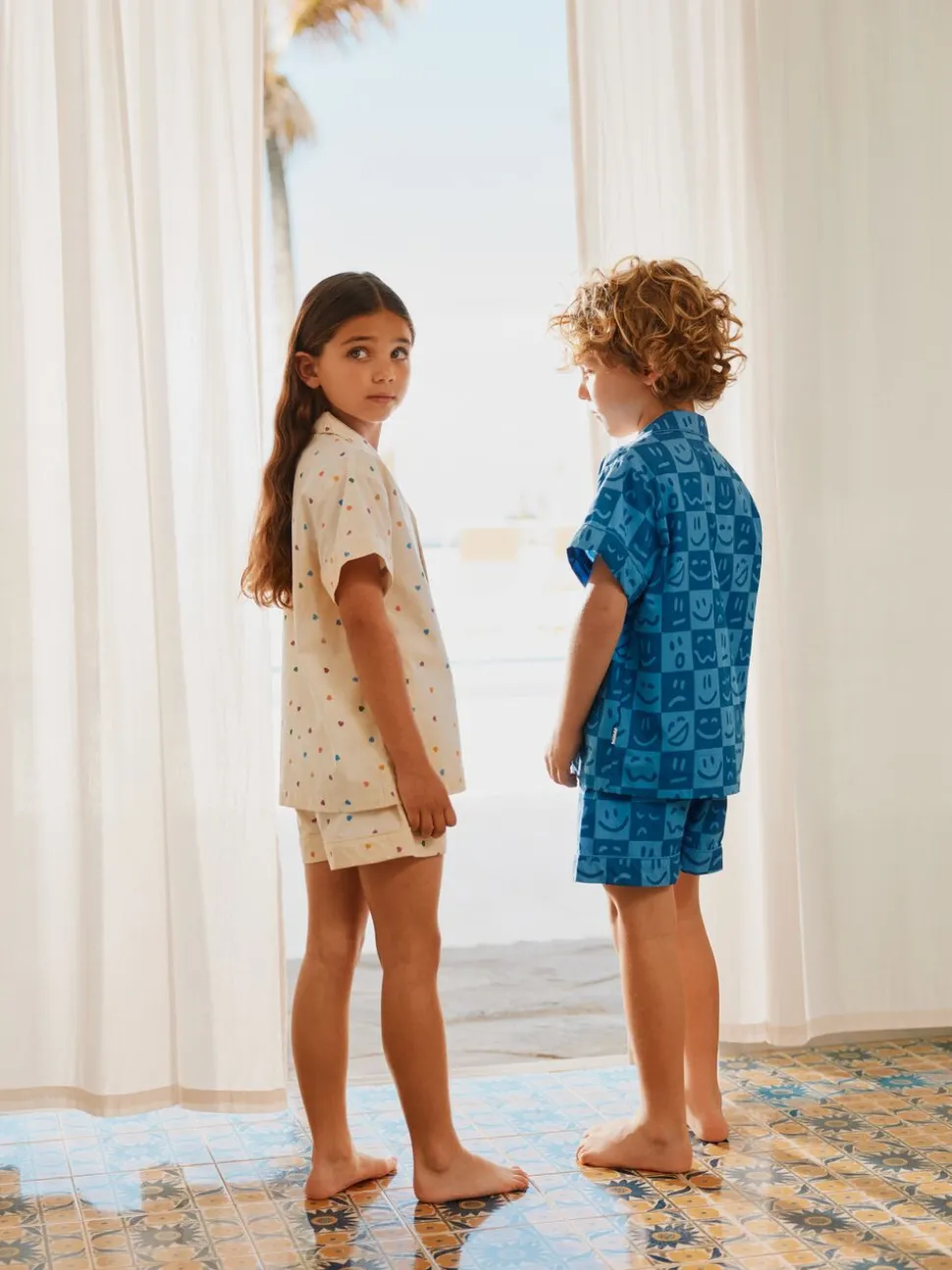 Denne todelte pyjamas i blød bomuld tilbyder komfort og stil. Den korte ærmelige skjorte med krave og knapper komplementeres af shorts med elastik og snøre i taljen, hvilket sikrer en god pasform under leg og søvn. Det livlige print af små hjerter tilføjer et legende element, der gør sætning til en sjov favorit for både børn og forældre. Perfekt til varme dage.