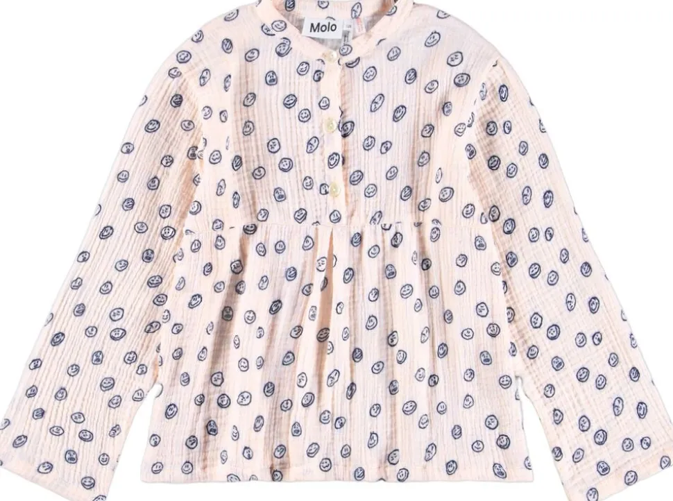 Dette nattøjssæt fra Molo er fremstillet i dobbeltvævet økologisk bomuld. Sættet er lyserødt med et blåt print af smilende ansigter. Toppen har knapper foran og et peplumskørt, mens bukserne har en løs pasform og elastik i taljen.