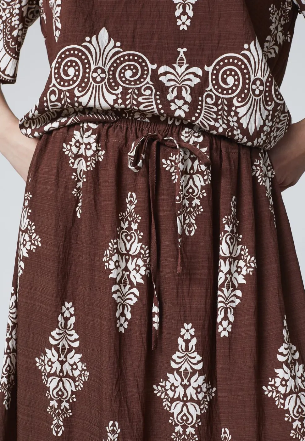er en lang nederdel med elastik i taljen og et bindebånd. Nederdelen har et gennemgående mønster og en bred, dekorativ kant forneden. Modellen har en str. S på og er 171 cm høj.