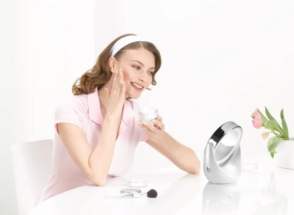 Et optimalt makeupspejl til dig, som vil helt tæt på med 5 x forstørrelse og LED lys, så det bliver endnu lettere at se. Den matte hvide farve og krom finish, der indrammer spejlets 11 cm i diameter, passer perfekt på et badeværelse. Spejlet kan vippes, hvor der på den ene side er et normalt spejl og på den anden et spejl med 5 x forstørrelse. Der er desuden lys i begge spejle. Makeupspejlet er batteridrevet og der medfølger 3 stk. AAA batterier.