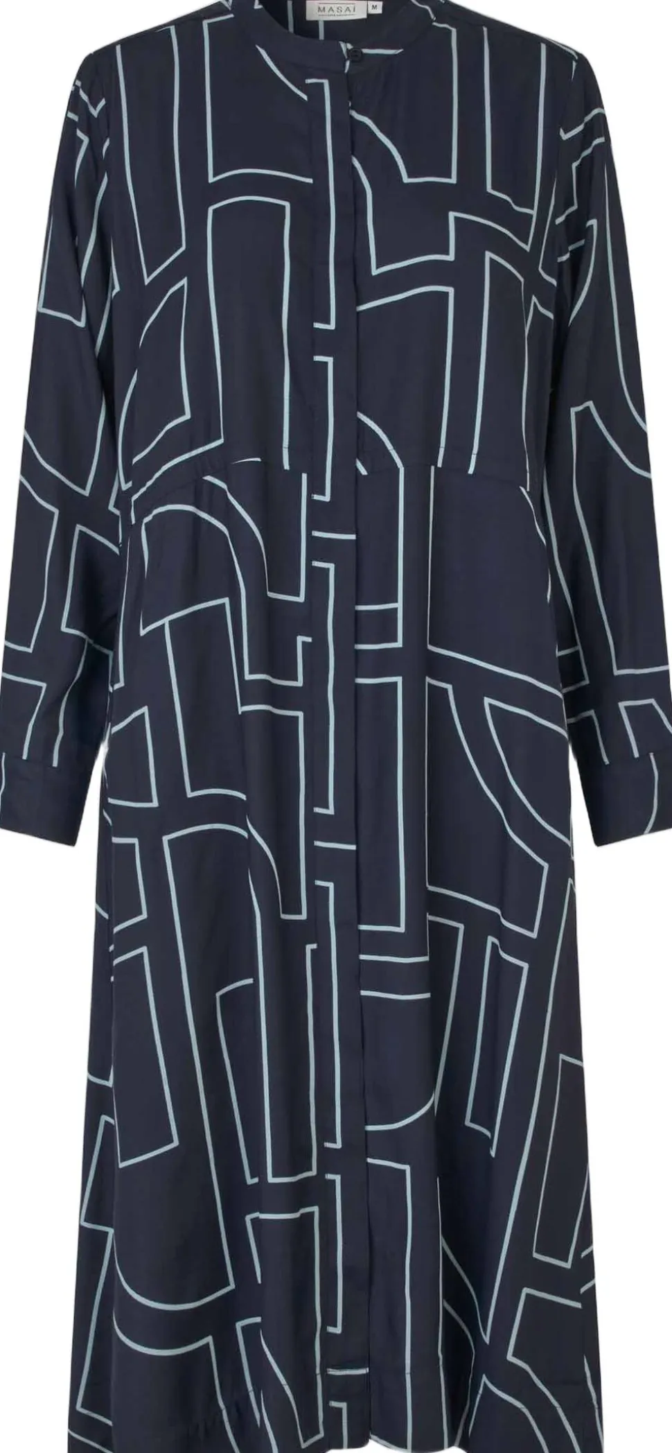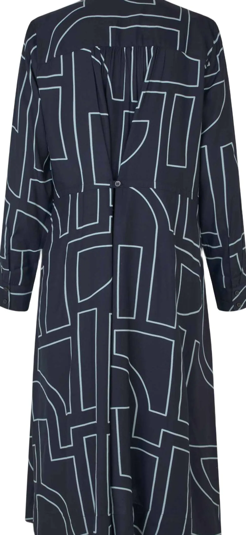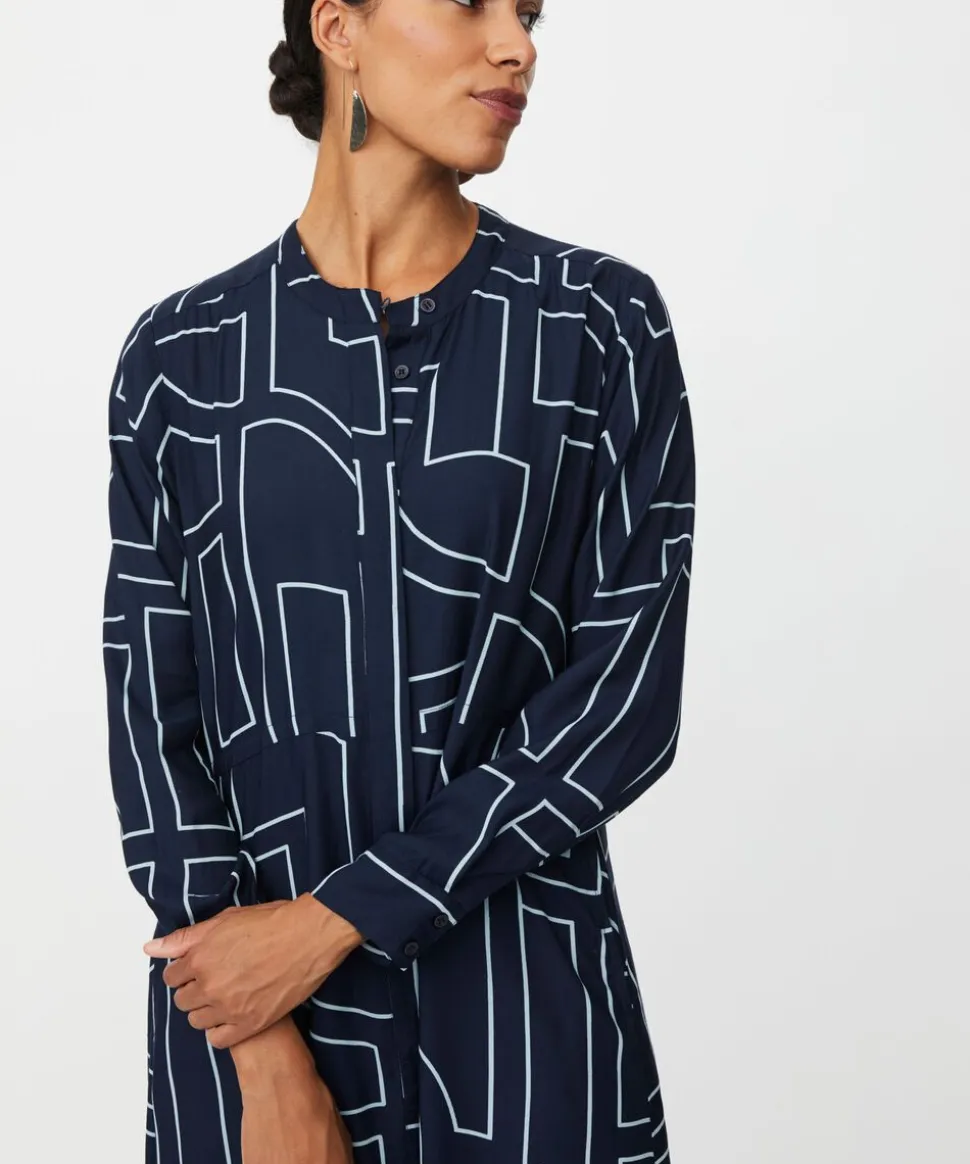 Er du vild med grafiske print, vil denne skjortekjole få dit hjerte til at banke lidt hurtigere. Kjolen har et flot A-formet snit med mulighed for at fremhæve taljen yderligere med en knap på ryggen. Den er designet med rund hals, skjult knaplukning og stiklommer foran. En feminin kjole i blød viskose, der samtidig gør den skøn at have på. Varen er FSC certificeret