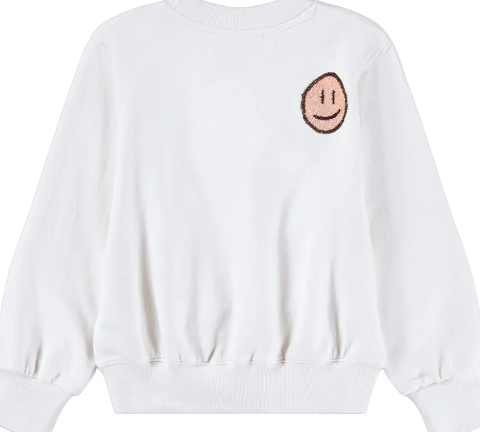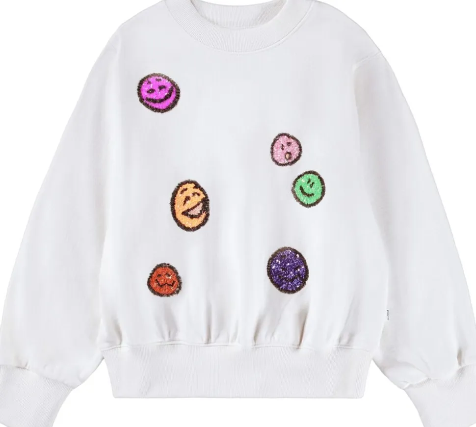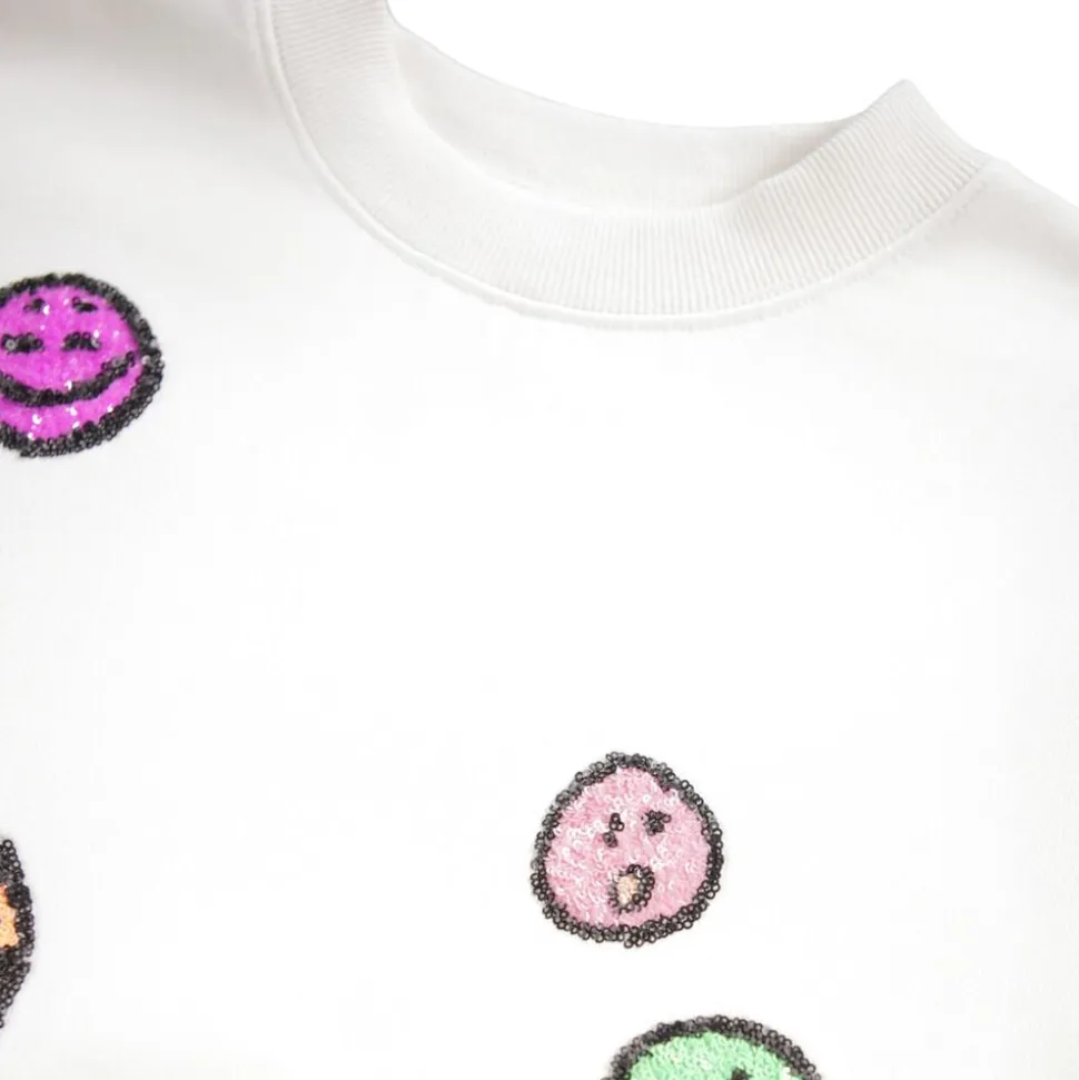 Denne råhvide sweatshirt fra Molo er lavet af økologisk bomuld med rund hals og ribkanter. Sweatshirten har en oversize pasform og er broderet med multifarvede paillet-ansigter på fronten.
