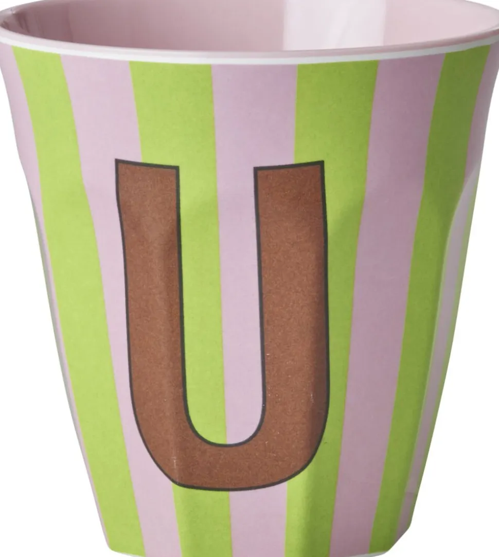 Den skønne melaminkop med bogstaver. Mix og match på kryds og tværs, og skriv lige det budskab, der falder dig ind med de forskellige kopper. Eller gør det enkelt for alle i familien at have deres helt egen personlige kop. Her er bogstavet U. Koppen er en favorit, og det er der god grund til. Brug den til alt muligt – som drikkekrus, til skriveredskaber eller til lækre smoothies. Kun fantasien sætter grænser. Vær opmærksom på, at produkterne ikke er egnet til mikroovn.