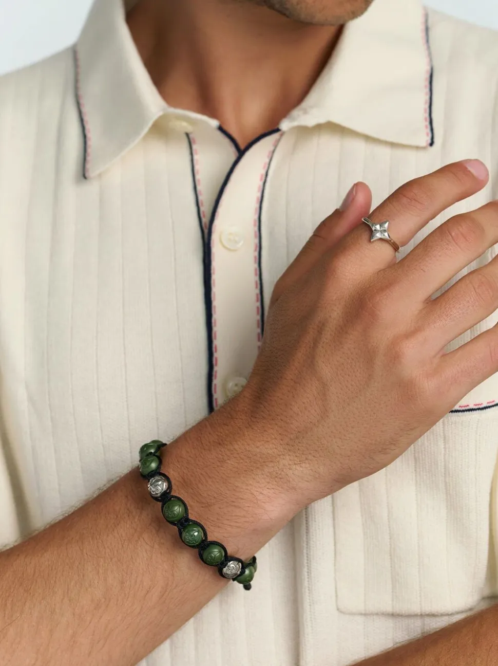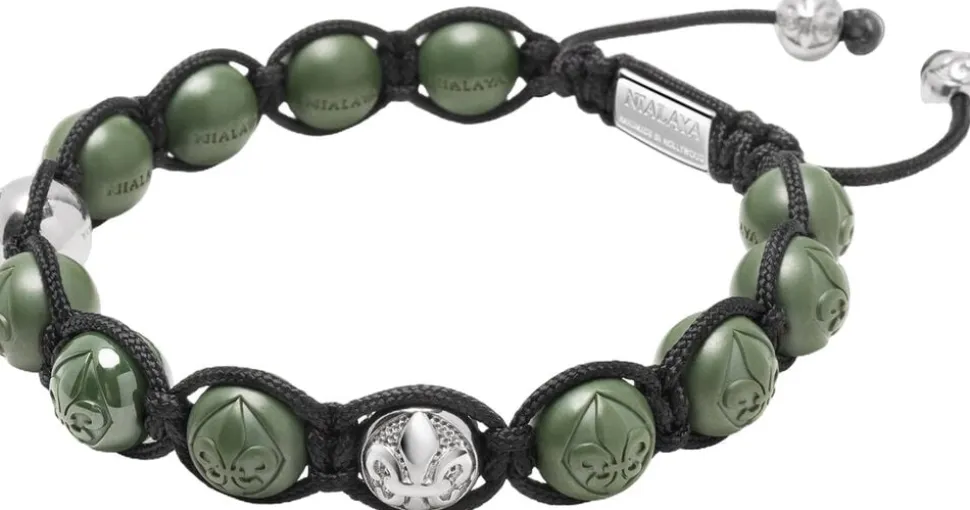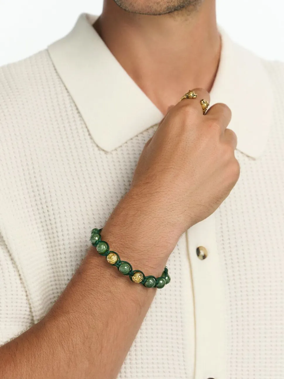 Beaded-armbånd til Herre med 10MM blank grøn keramik og guldperler, 18.000 guld og 316L rustfrit stål, vand, varme, svedresistent, ingen misfarvning eller tandfarvning og allergivenlig. Håndlavet i Los Angeles