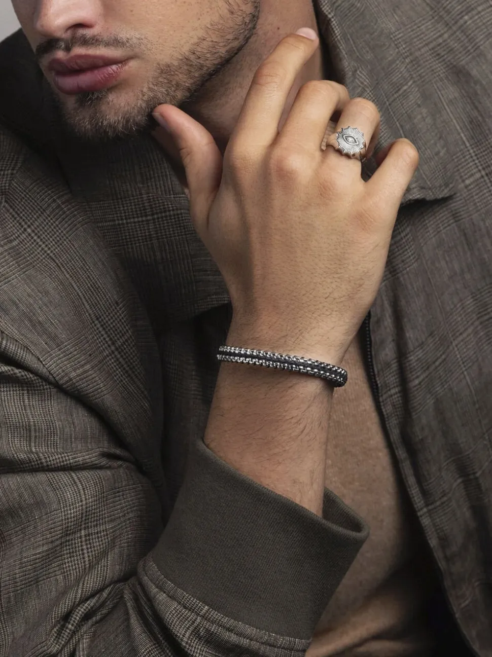 Black Woven Box-kædearmbånd til Herre i rustfrit stål med guldplade og lås i rustfrit stål med guldplade. Armbåndsbredde: 8 mm. Håndlavet i Los Angeles