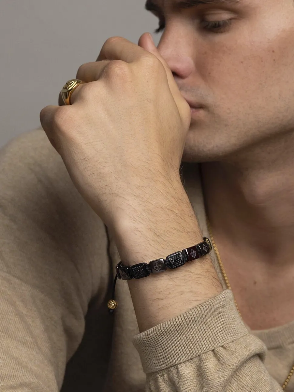 Bracelet med røde håndlavede keramiske perler, sort CZ Diamond Studded Gold og sorte flatbeads. Perlestørrelse: 9 mm x 10 mm. Lås i rustfrit stål med guldplade. Håndlavet i Los Angeles