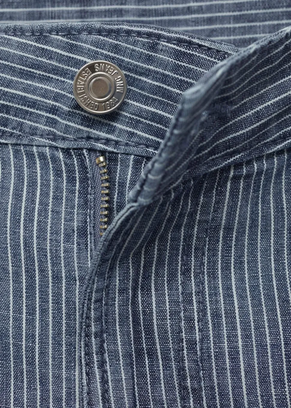 Bomuldsstof i denimstil, kort Design, stribet Design, mellemhøj talje, bæltestropper, Dart-detaljer, jeans med bindelukning, knaplukning og lynlåslukning.