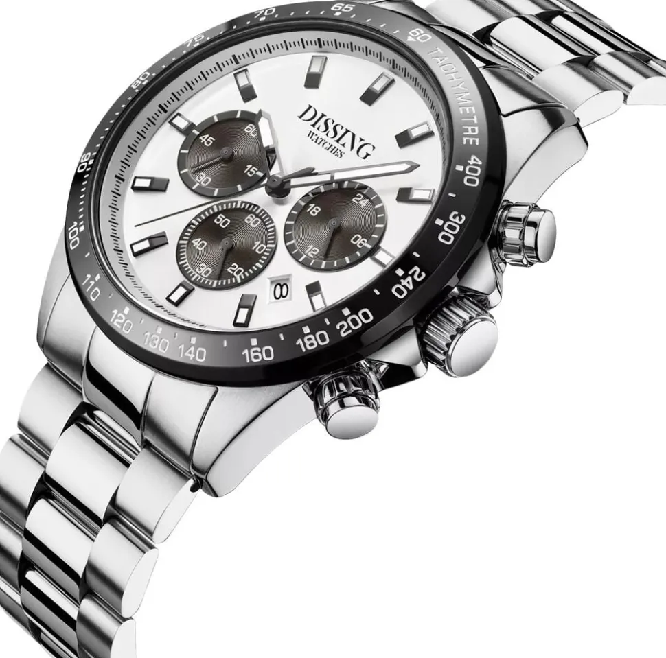 Dissing MK9 D1583 er et imponerende ur fra Dissing MK9 kollektionen, der har en rund urskive med tre kronografer, der tilføjer dybde til designet. Urskiven er hvid, indrammet af en sort bezel markeret med et tachymeter, hvilket giver det et sporty udseende. Med en diameter på 43 mm gør uret et stærkt indtryk på håndleddet, mens den sølvfarvede urkasse og stål-lænke giver et klassisk og robust look.