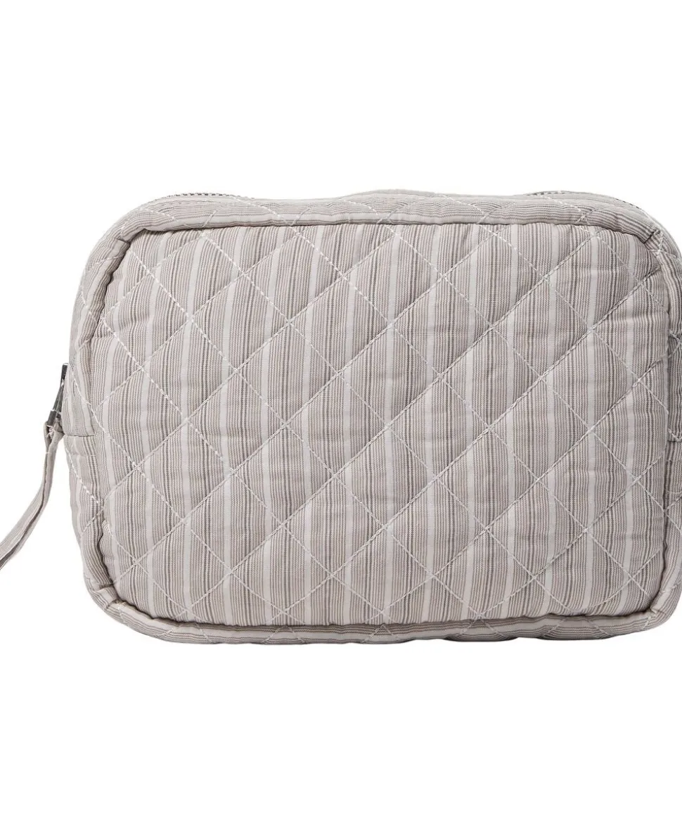 Toilettaske fra Magasin du Nord Collection i den blødeste kvalitet af 80% økologisk bomuld med GOTS-certificering. Toilettasken består af ét stort rum med lynlåslukning samt mindre inderlommer. Derudover har toilettasken fine vatterede syningsdetaljer og et stribet print. En skøn toilettaske i den lækreste kvalitet.