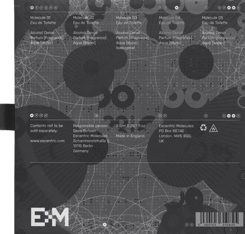 Molecule 8,5 ml Discovery Set EM’s Molecule Discovery Set er skabt til at opmuntre og mætte din duftende nysgerrighed. Dette sæt er designet til udforskning og giver dig mulighed for at genfinde alle fem af vores Molecule-dufte, før du bestemmer din foretrukne lugteflugt. Duftene er anbragt i 8,5 ml minihætteglas, nedskaleret for at udforske den radiale verden af Molecules og slukke alle dine duftbehov på farten. Molecule-duftene er rene og enestående og er radikalt minimalistiske og hylder de kemiske dufte, der udgør hovedparten af parfumer i sig selv. Geza Schoen ønskede at tage en konceptuel tilgang til olfaktorisk kreativitet og innovere på et molekylært niveau ved at reducere en duft ned til dens væsentlige elementer. Effekter, ikke dufte, hvor en enkelt aroma-kemikalietone giver de mest dynamiske resultater: friskhed og sexappeal. Molekyle 01: Revolutionær minimalisme Molekyle 02: Mineralsk rav Molekyle 03: Græsrødder Molekyle 04: Cocooning Radiance Molecule 05: Piney Cashmere Alle fem Molecule-dufte er fyldt med karakter og uoverskuelige for kønsforskelle. Disse humørfyldte skønheder rummer alle et net af mangfoldige betydninger, definitioner og fornemmelser. For at opdage EM’s Escentric-dufte skal du købe deres Escentric Discovery-sæt, der indeholder EM’s fem 8,5 ml elskede flasker med syntetiske parfumehæfteklammer.