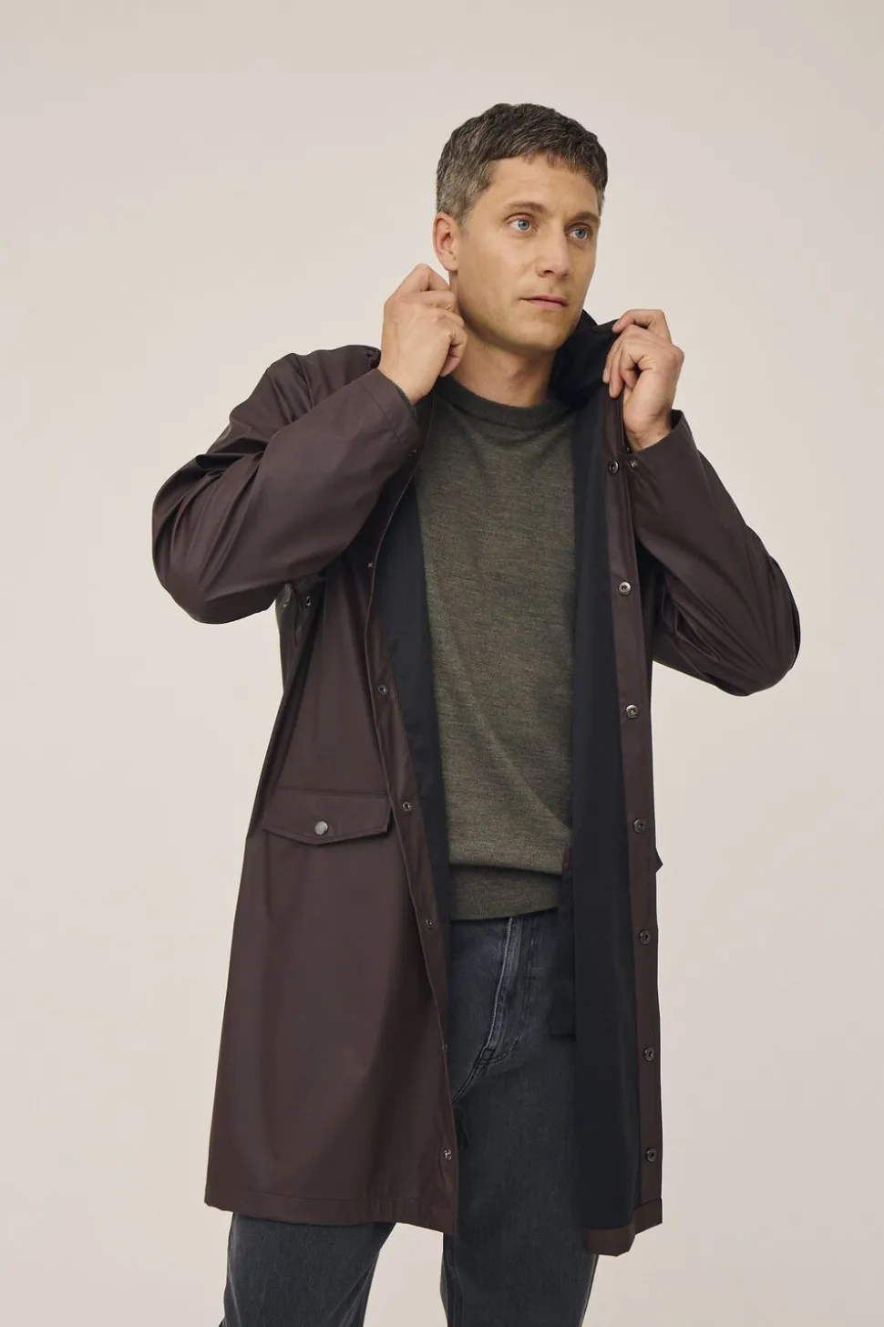 – Praktisk design: Regnjakken har en hætte med snøre, der giver mulighed for justering og ekstra beskyttelse mod vind og regn.