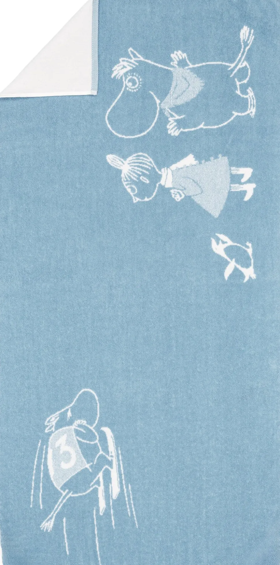 Vintersportseventyrene fortsætter, da Mumitrolden beslutter sig for at deltage i skihopkonkurrencen i et forsøg på at imponere Snorkfrøken. Når Snorkfrøken finder ud af, hvor farligt det er, forsøger hun at stoppe Mumitrolden men det er for sent! Mumitroldens svæv i luften er imponerende, men ender i træerne. Moomin Arabia badehåndklæde 70×140, Skihop
