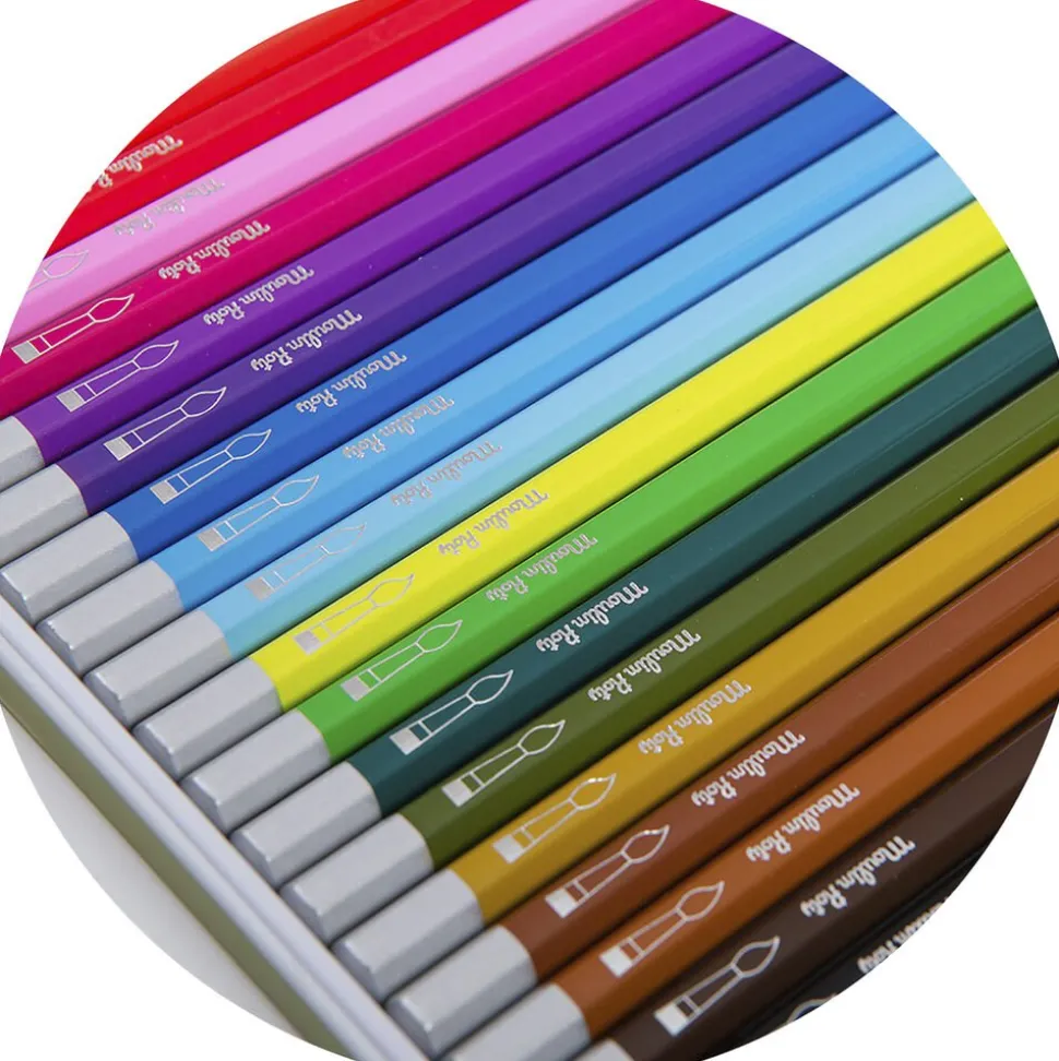 24 akvarel farveblyanter i lyse farver leveres i en metalæske med fine illustrationer.