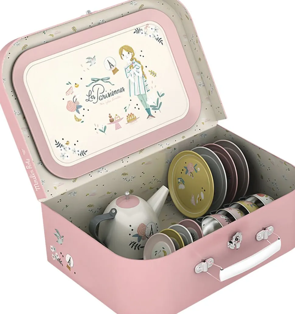 Metal testel i en fin kuffert. Delene er i pastelfarver med blomstermønster og små parisiske illustrationer af Lucille Michieli.
