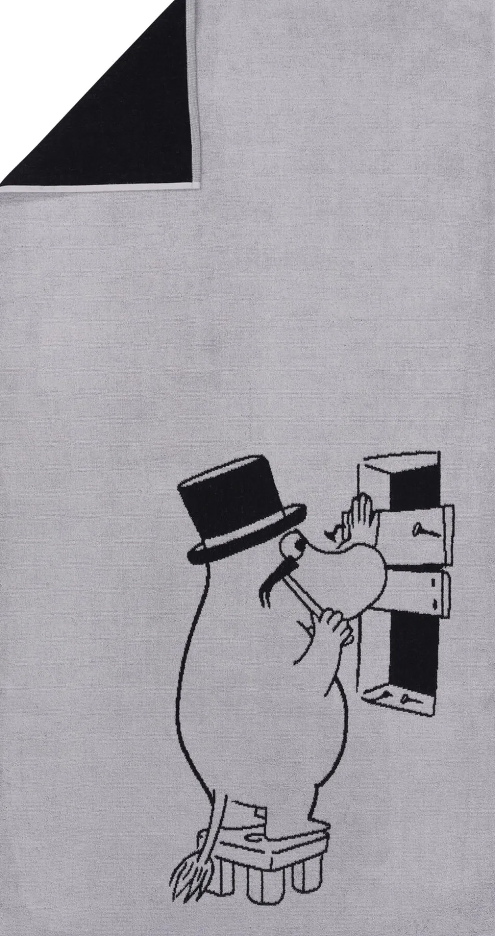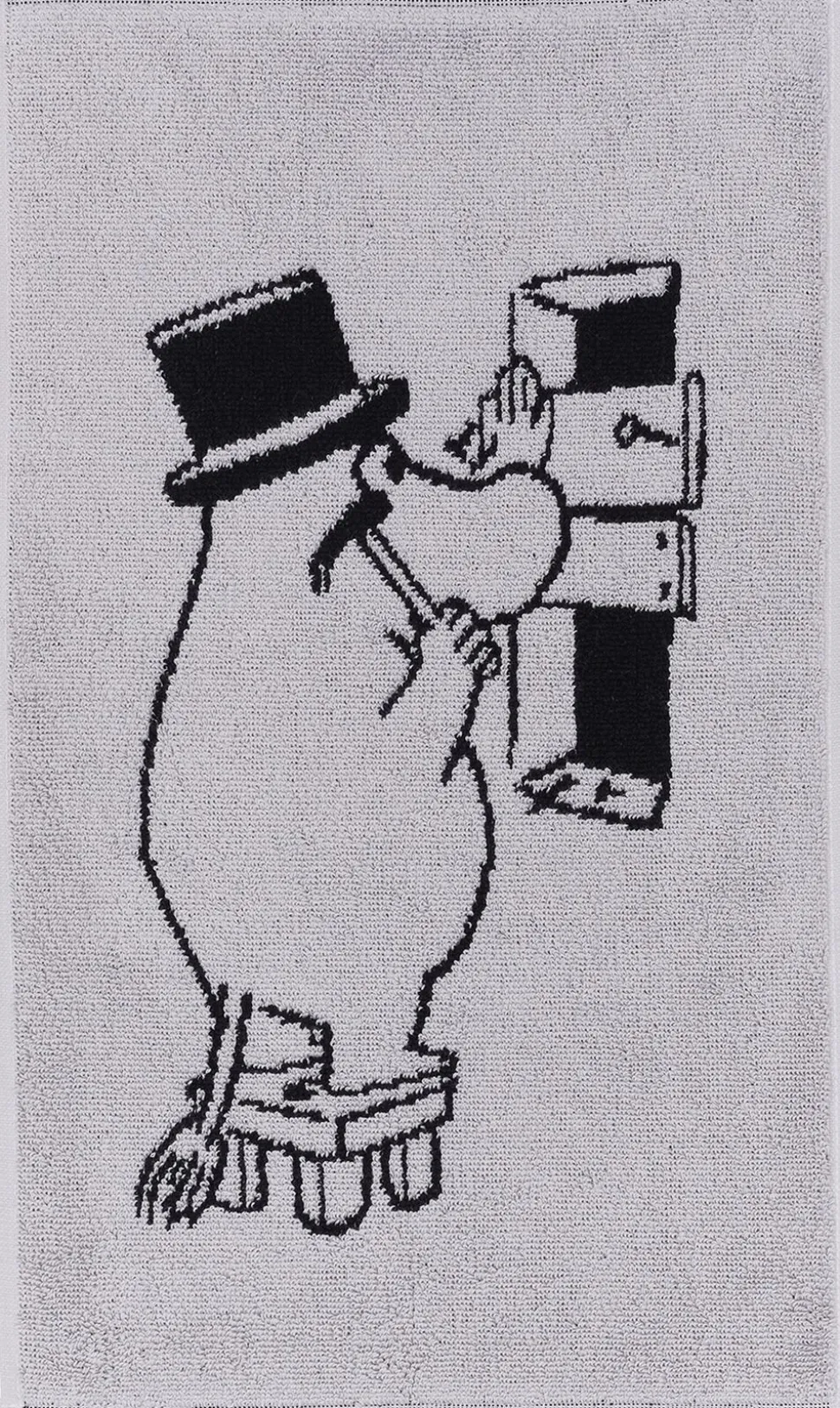 Nyd den bløde hygge i Mumihåndklædet med motiv af Mumifar som dygtig handyman. Mumi h. håndklæde 30×50 Mumifar grå, økologisk bomuld.