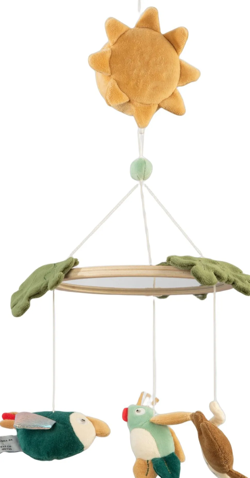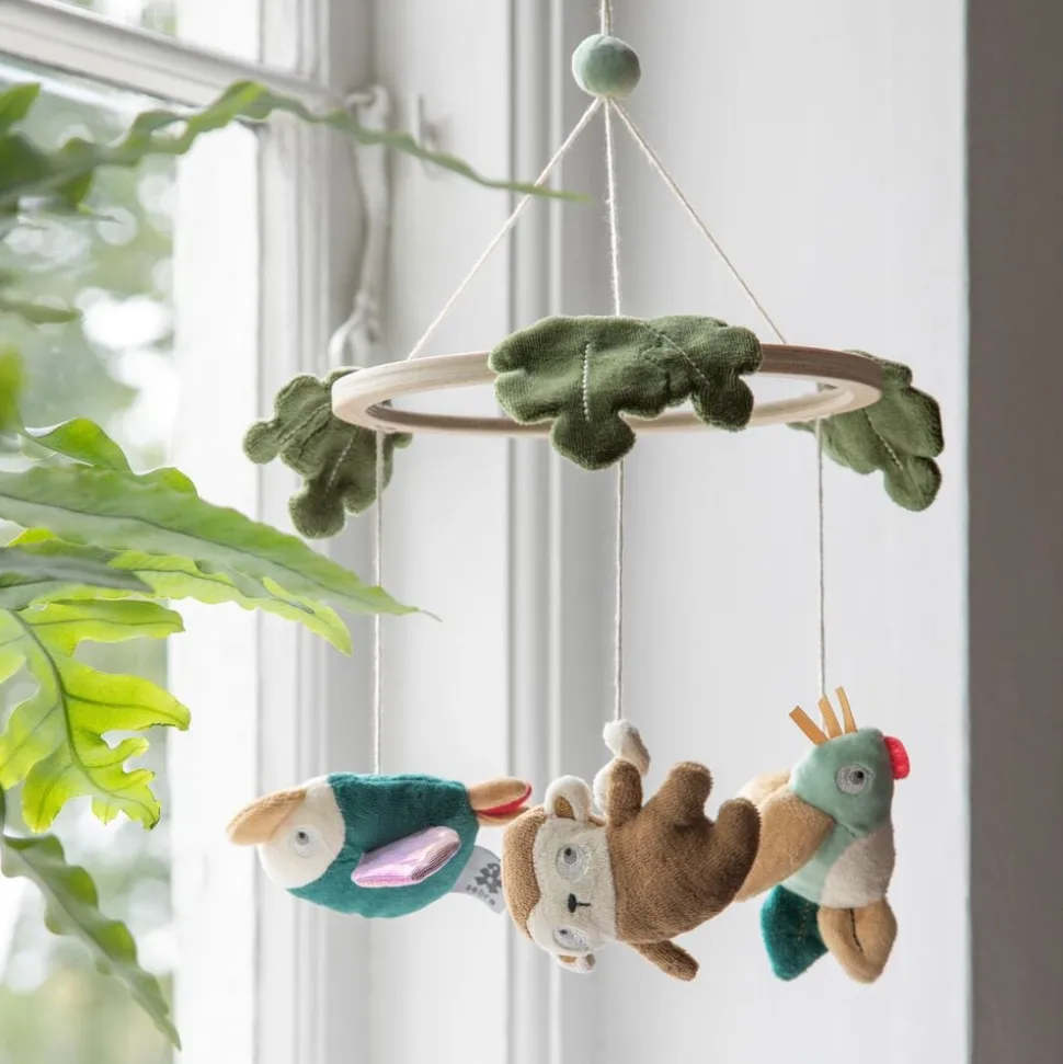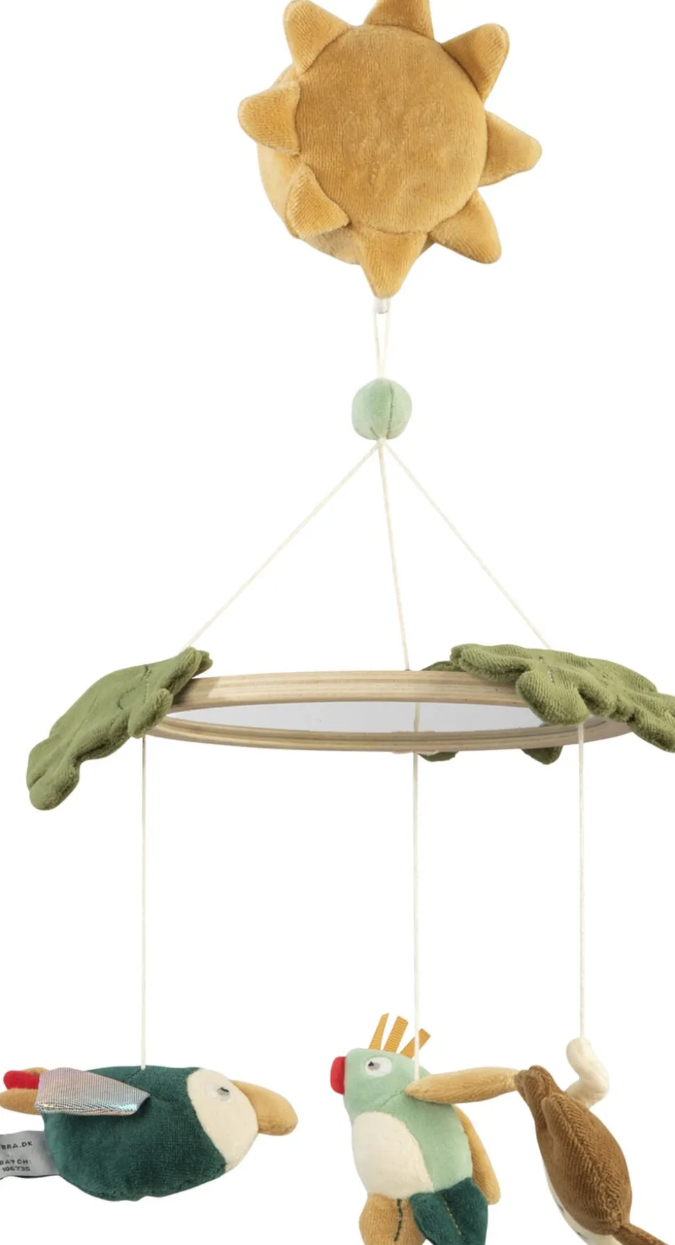 Musikuro med spejl, hvor baby kan udforske sit spejlbillede mens uroen spiller en lille melodi. De tre tøjdyr fra Wildlife-temaet drejer stille rundt og stimulerer babys sanser med forskellige former og farver.