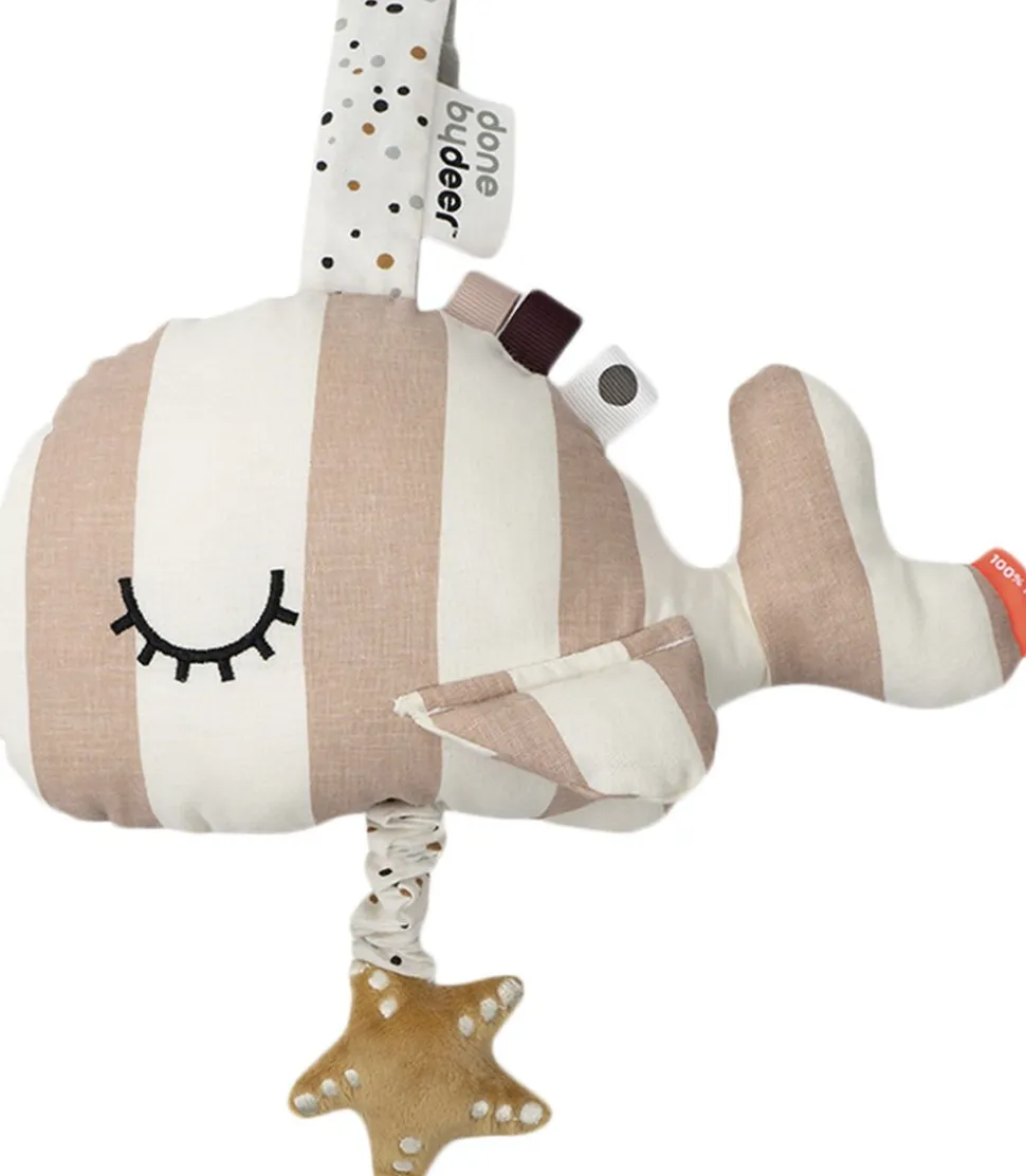 Lad søde Wally lulle de små i søvn eller lad den underholde ved puslebordet med den beroligende melodi ‘Over the rainbow’. Træk i den bløde søstjerne under Wallys mave, så vil den søde melodi afspilles. Det yndige musikalske legetøj er en dekorativ tilføjelse til børneværelset. Den praktiske velcro lukning gør det nemt at fastgøre den hvor som helst. Den søvnige hval med fine hvide og pudderfarvede striber har søde detaljer med kontrastfulde prikker og en blød søstjerne på maven. Den vil berolige de små, når det er tid til at slappe af eller tage på tur til drømmeland.