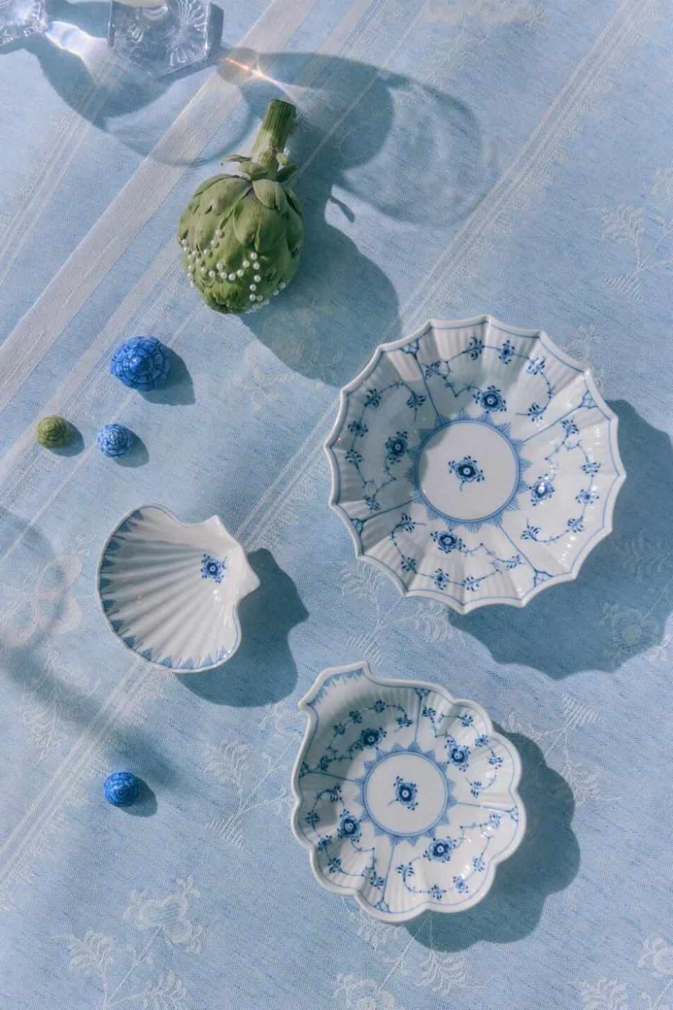 Dette sæt med tre serveringsdele er den perfekte tilføjelse til enhver samling. Formerne bærer referencer til havet, der smukt knytter sig til de ikoniske tre bølger, der kendetegner Royal Copenhagens porcelæn, mens Musselmalet Riflets alsidige dekoration pryder de tre dele. Perfekt til alt fra salt, olivenolie og smør til smykker på natbordet.