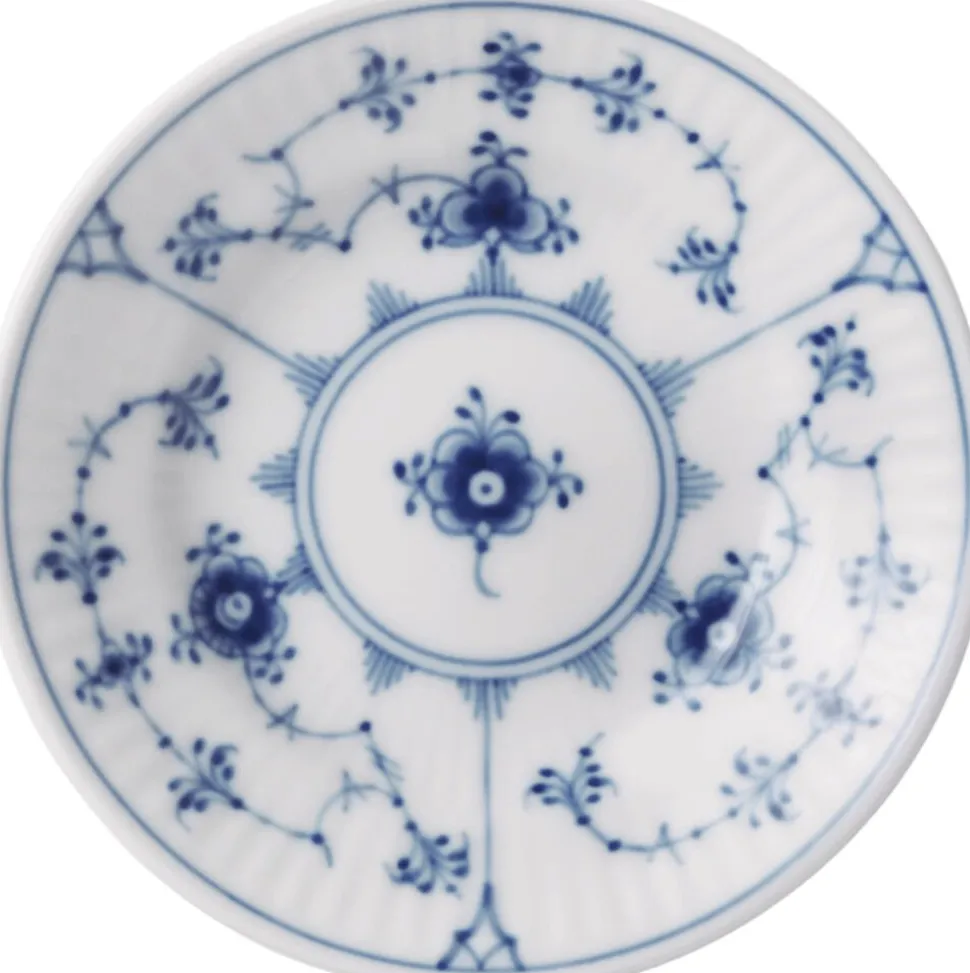 Skønhed i en delikat størrelse: Den lille, smukke tallerken i Musselmalet Riflet passer perfekt til kanapeer eller som soyaskål til sushi.